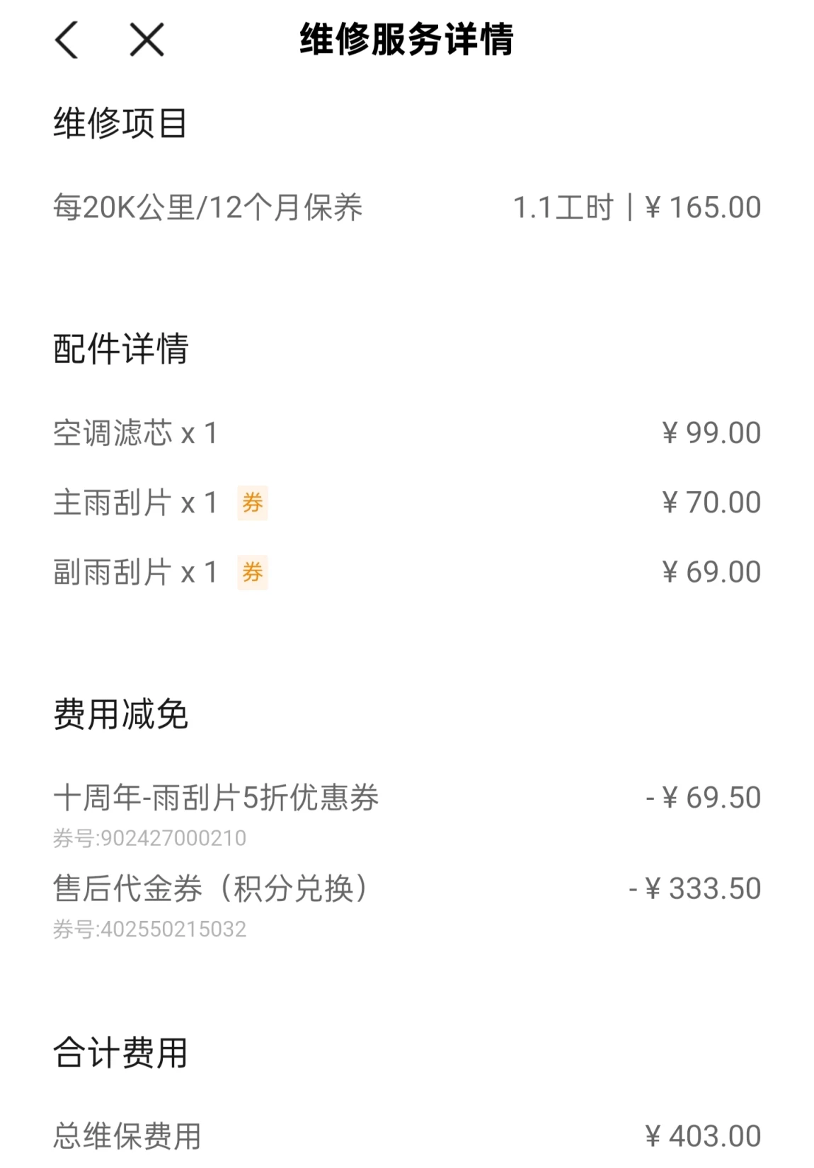 其次就是保养了:小鹏的保养是2万公里一次,所以今年我也就保养了一次,保养费用是330元,我换了一副原厂的雨刮器,所以一共是400元,(当然如果大家愿意动手自己更换空调滤芯,是可以省100元的)!