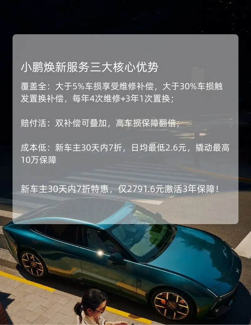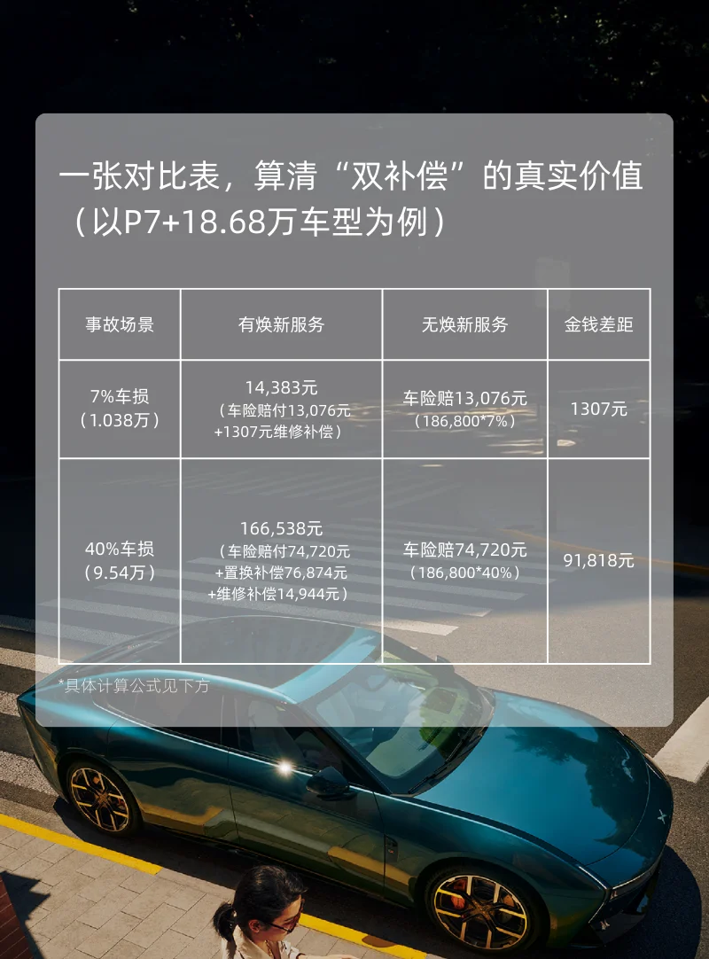 普通车险只报销基础维修,而小鹏焕新服务的“双补偿”,从维修到置换全覆盖,带来更多事故后的经济补偿。