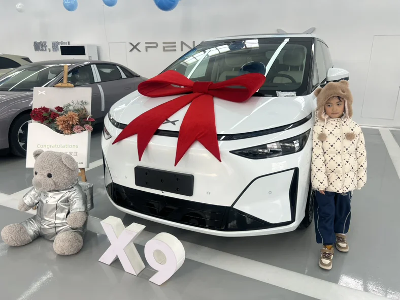 今天终于把小鹏X9提回家了,到交付中心看到装饰着大红蝴蝶结的车时,真的忍不住心头一热,赶紧拉着娃在车前拍了合照,这画面必须好好珍藏~