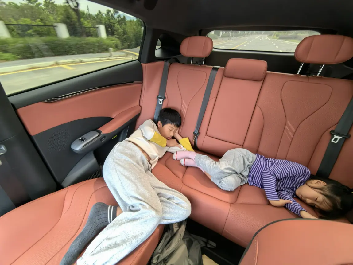 带着两个孩子出行时,睡眠空间和冥想空间功能成为我们的“休息神器”。副驾可以完全躺平,后排放倒后也能形成平整空间。午休时间或长途旅行中,孩子们能在舒适的环境中休息。最有趣的是,小女儿有次竟在后备箱处不小心睡着了(当然,我们非常注意安全,不鼓励在行驶中这样做),这侧面证明了G7空间的舒适与宽敞。