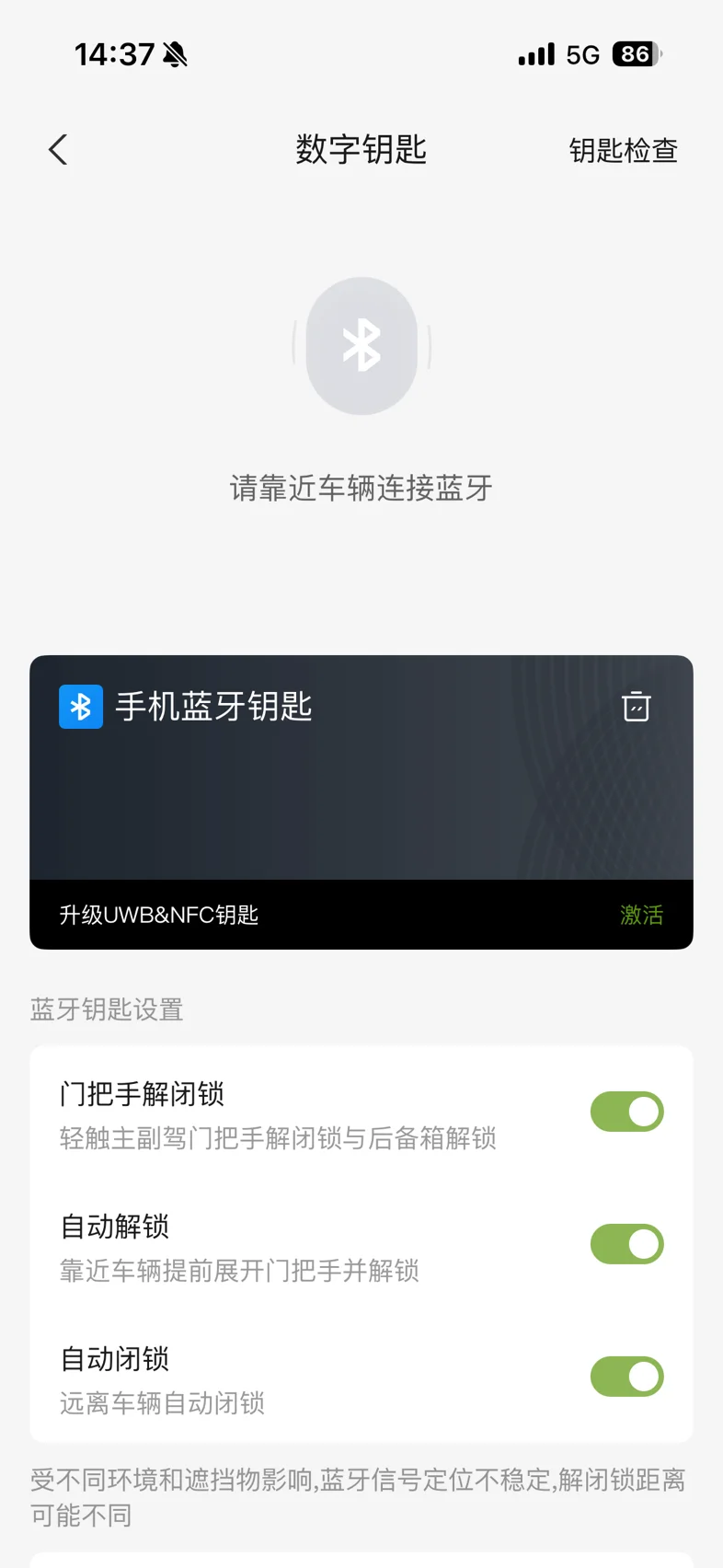 一开始还以为没有实体钥匙会不方便,但是这个蓝牙钥匙很好用,没有发生过罚站的情况,只要出门带手机了就能开车。