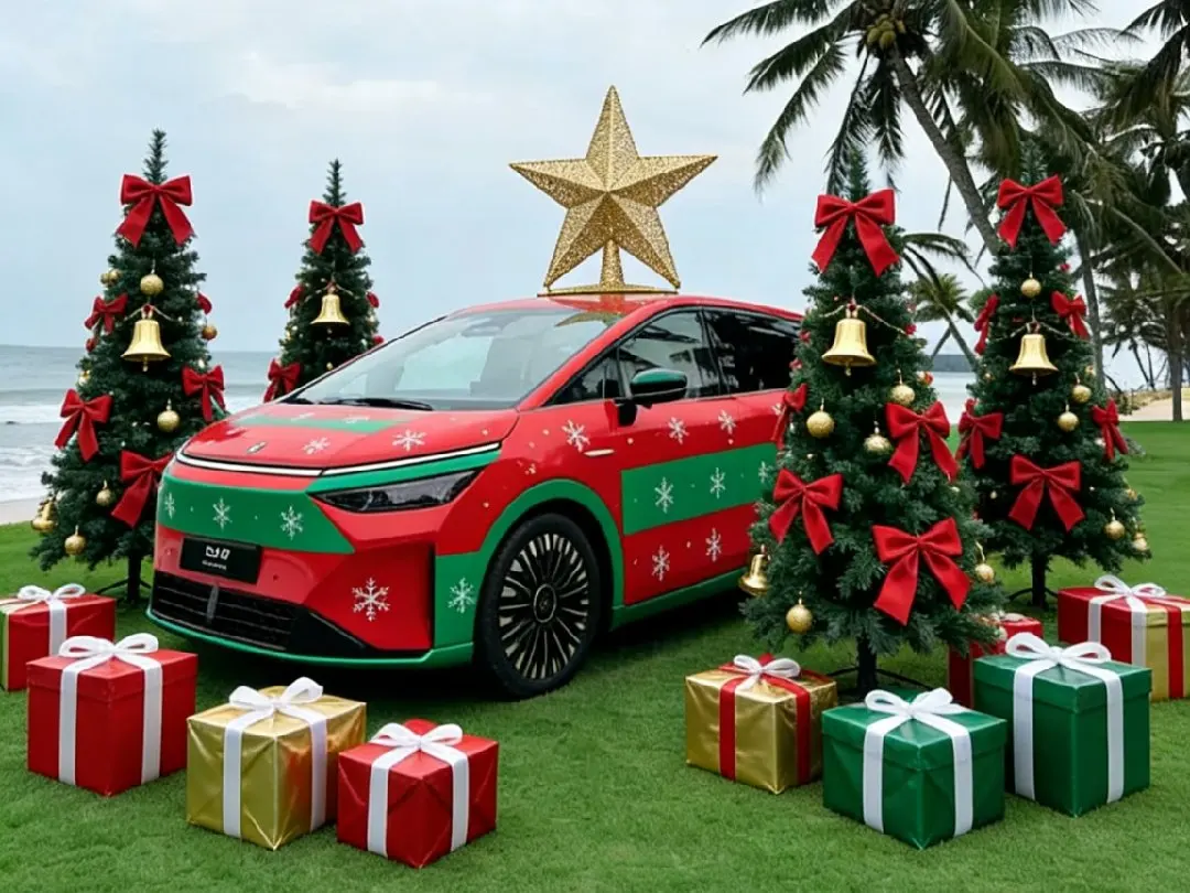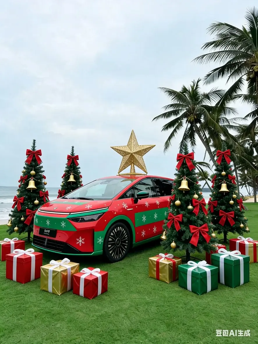 先说说车身改造,我选了经典的圣诞红为主色调,车顶和车身腰线用松枝绿做撞色,还贴了雪花、麋鹿的镭射贴纸,阳光底下闪闪闪的,像裹了一层圣诞糖霜~车门把手挂了迷你圣诞袜,充电口位置贴了小圣诞树贴纸,细节控表示超满足!