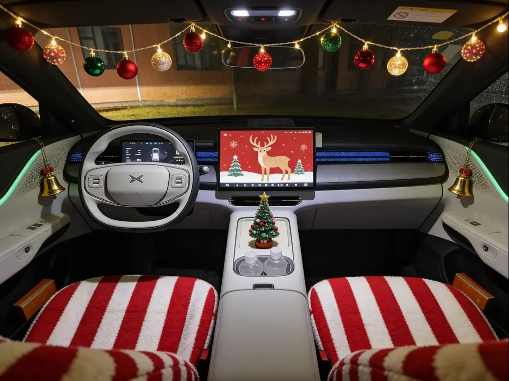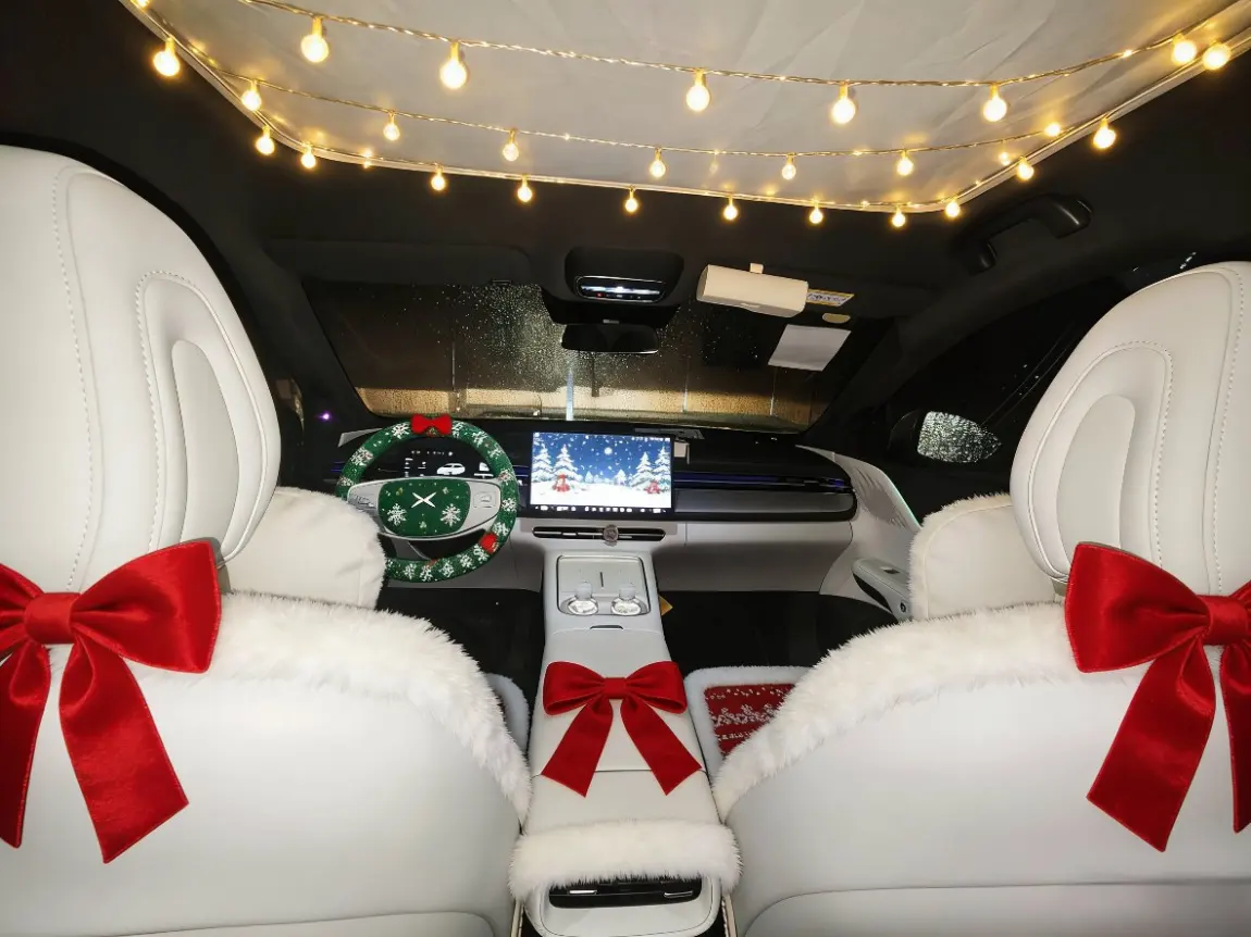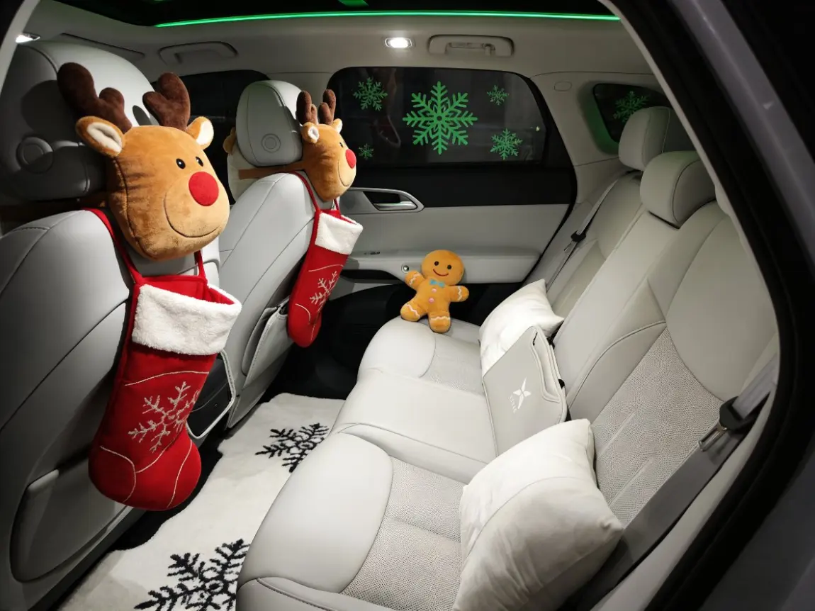 再钻内饰:车顶缠满暖黄小串灯,一坐进来就裹着柔光;前排座椅套上红白条纹的毛绒垫,方向盘圈着绣雪人的绿花环,中控屏循环播着驯鹿踏雪的动画,扶手箱还蹲了棵迷你圣诞树;后排更热闹,头枕挂着驯鹿造型的圣诞袜,座椅旁蜷着圆滚滚的姜饼人玩偶,车窗贴满荧光雪花贴,连脚垫都是绣着雪纹的毛绒款。