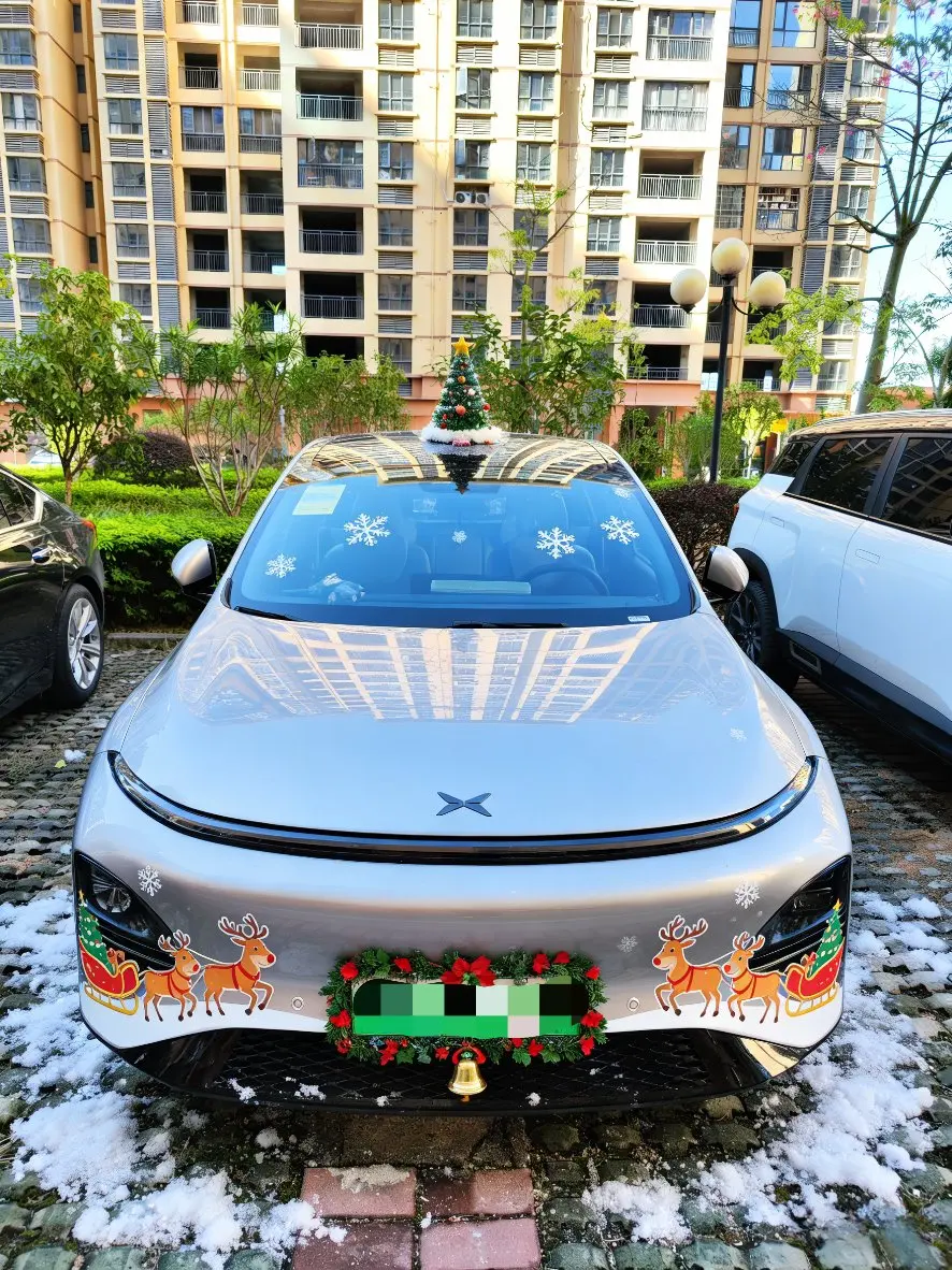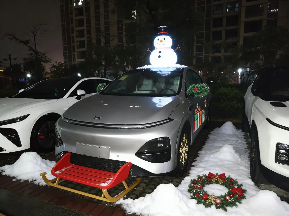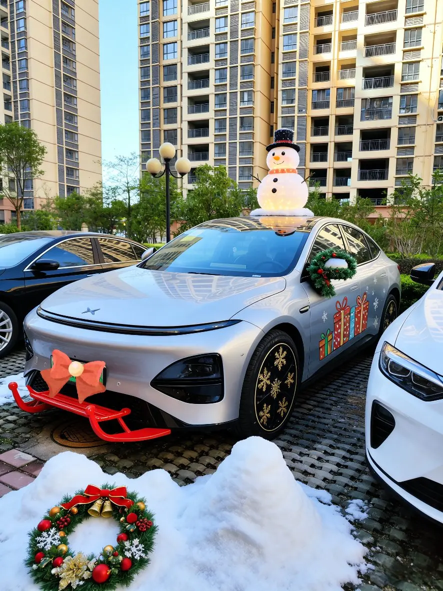 先看外观:车顶要么蹲只圆滚滚的发光雪人,要么顶棵缀着星星的迷你圣诞树,前唇焊上红金配色的雪橇装饰,车身印着堆得冒尖的礼物盒,连轮毂都嵌满了雪花纹样;车头两侧贴了小鹿拉雪橇的萌趣贴纸,车牌被红绿松枝花环裹得严实,还坠着晃悠悠的铜铃铛,连停车的地面都铺了层 “细雪”—— 哪怕是不下雪的南方小区,这台车一停稳,圣诞的雀跃感就顺着 “雪” 尖漫出来。
