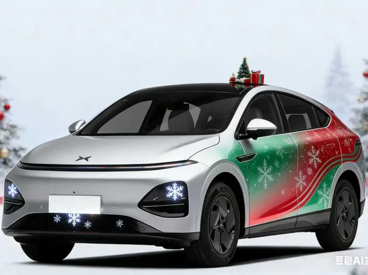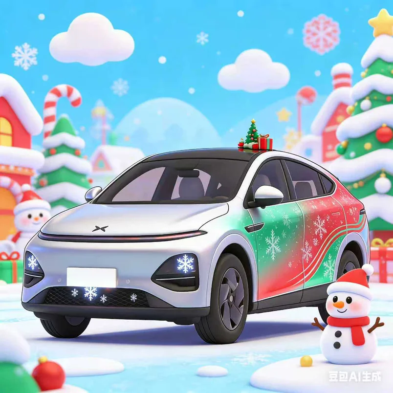 头一张是银灰车身裹了红绿渐变的皮,雪花印子爬满车门,车顶还顶了棵迷你圣诞树,挂着红盒子礼物,像从圣诞糖纸里剥出来的似的,往雪地里一停,活脱脱个移动的圣诞礼盒,那股子热闹劲儿,隔着屏幕都能摸着。