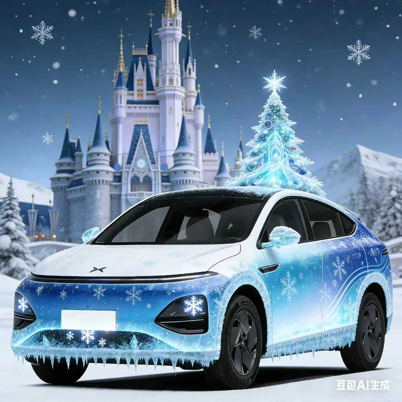 第三张的调子冷了点,冰蓝裹满车身,像是结了层透亮的薄冰,车灯里嵌着雪花,车顶那棵圣诞树还发着光,背景是尖顶城堡和雪岭,倒有了点童话里冰原座驾的意思,瞅着挺唬人,像是能直接开去雪国城堡似的。