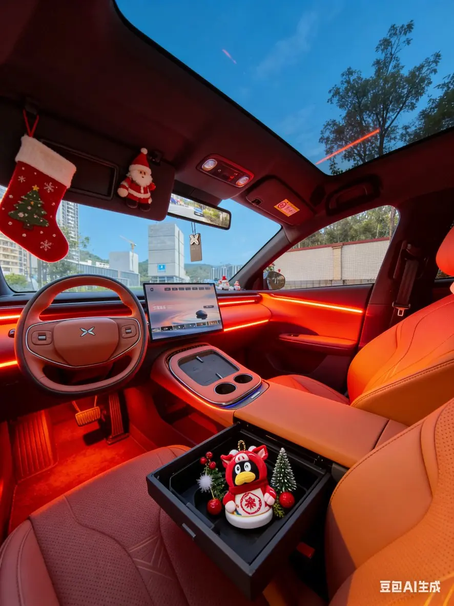 喊一句 “你好小 P,打开圣诞模式”,车机直接切圣诞壁纸 + 氛围灯变红,连空调风都像裹了姜饼香~