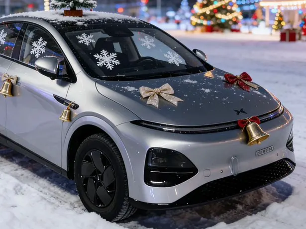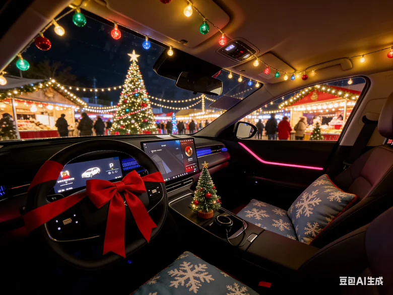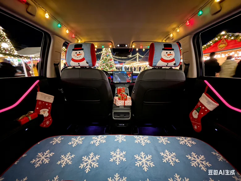暖黄串灯缠在天幕边缘,方向盘系上花环,扶手箱摆上mini圣诞树,连香氛都换成了肉桂雪松味🎁