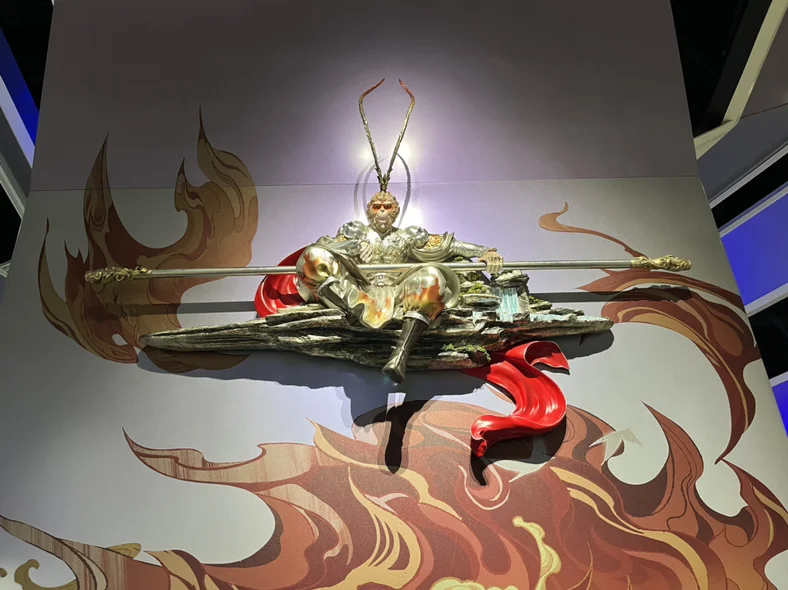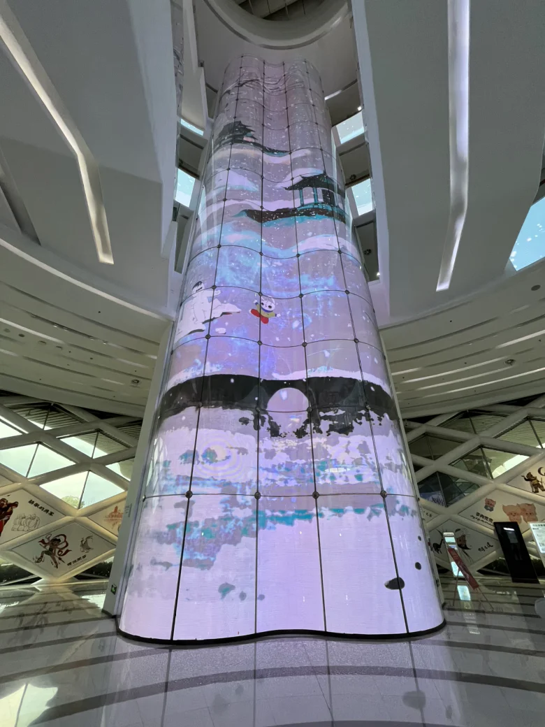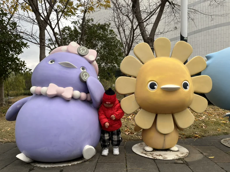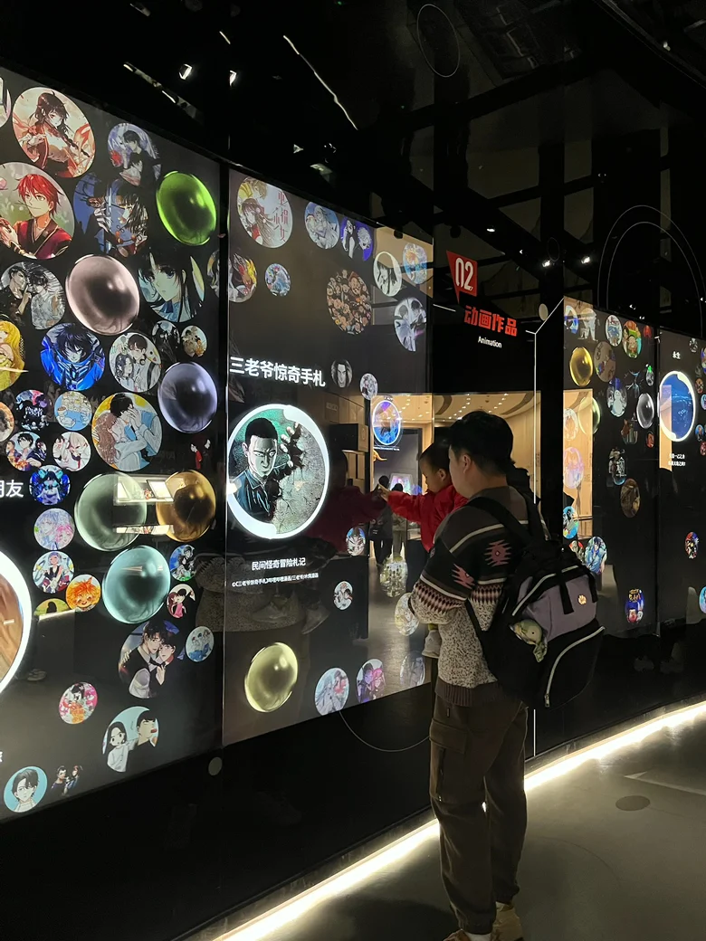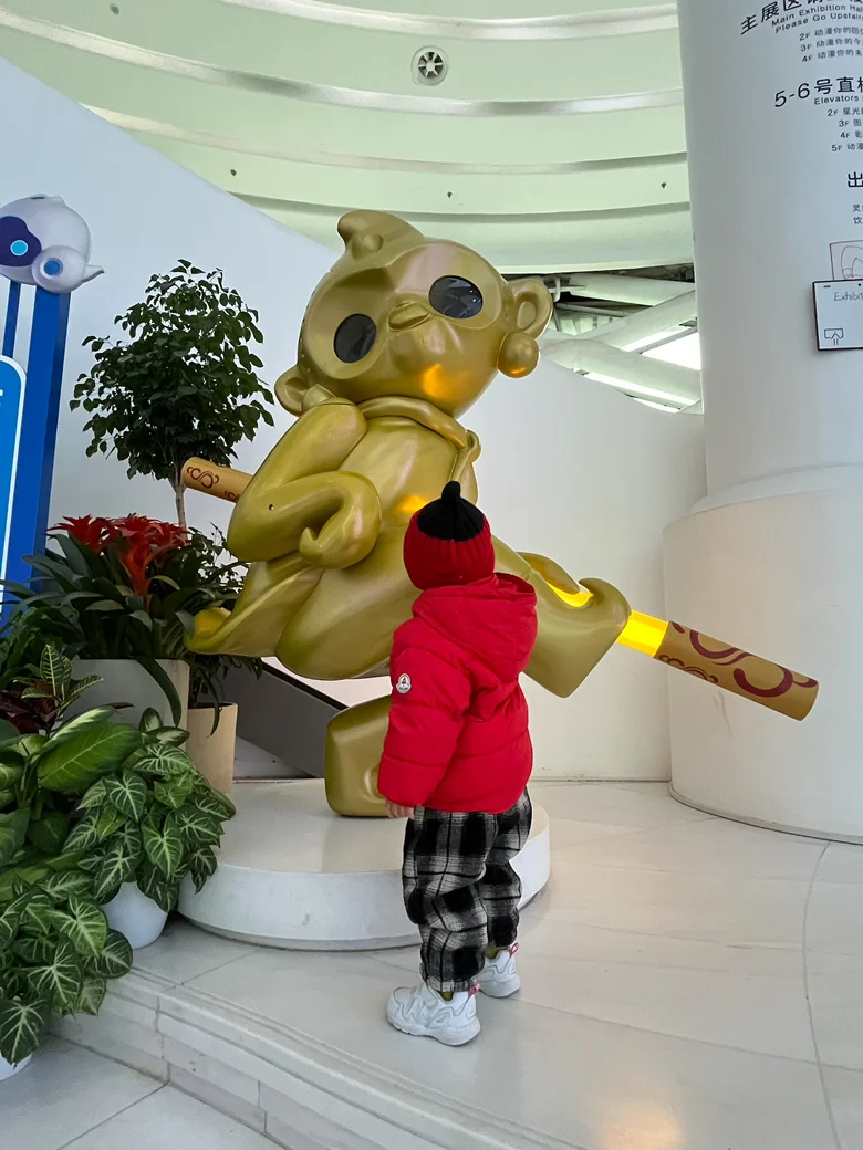 踏入馆内,仿佛闯入了一个五彩斑斓的动漫世界。入口处的巨型屏幕瞬间抓住了孩子的目光,里,小兔子、小松鼠等卡通形象在屏幕里显得栩栩如生,小朋友站在装置前,好奇地伸手触摸,嘴里不停念叨“这个小兔子好像在和我打招呼”。我拿出相机,定格下他仰头张望的可爱模样,边上还有一个孙悟空的造型,看得出来他也非常好奇和喜爱。