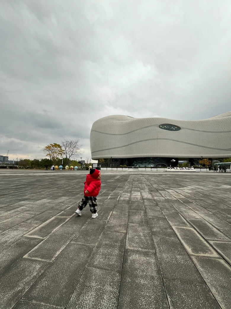 小朋友刚下车就挣脱我的手,朝着场馆大门飞奔而去。