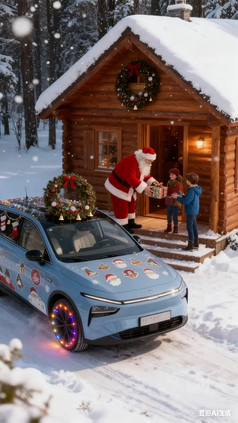 圣诞老人看到行驶来的小鹏,伸手向他招手打招呼。