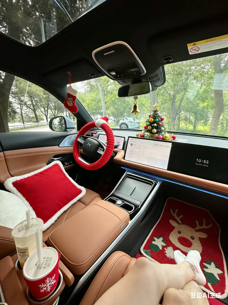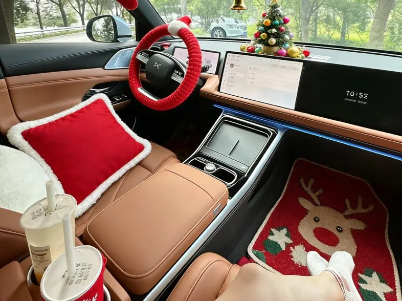 #我的圣诞魔力座驾# 圣诞夜的晚风裹着街边彩灯的暖意,钻进小鹏G9的全景天窗里。我把座椅调到最舒服的角度,脚边是冰饮,手边是刚拆的圣诞小礼物,中控屏的光映着窗外一闪而过的圣诞树,松枝的香气好像都飘进了车厢。