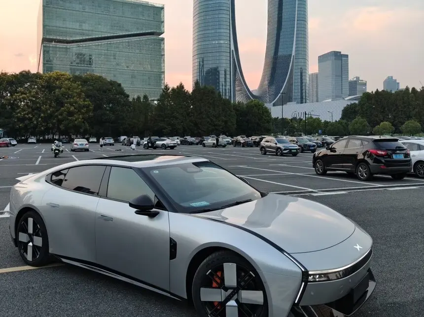 那是一个工作日的傍晚,我驾驶小鹏P7穿行于城市。停在某个停车场时,一抬眼,便被眼前的景象击中——流线型的银灰车身后,是勾勒城市天际线的几何建筑,冷峻的玻璃幕墙映着柔和的天空。我立刻按下快门。