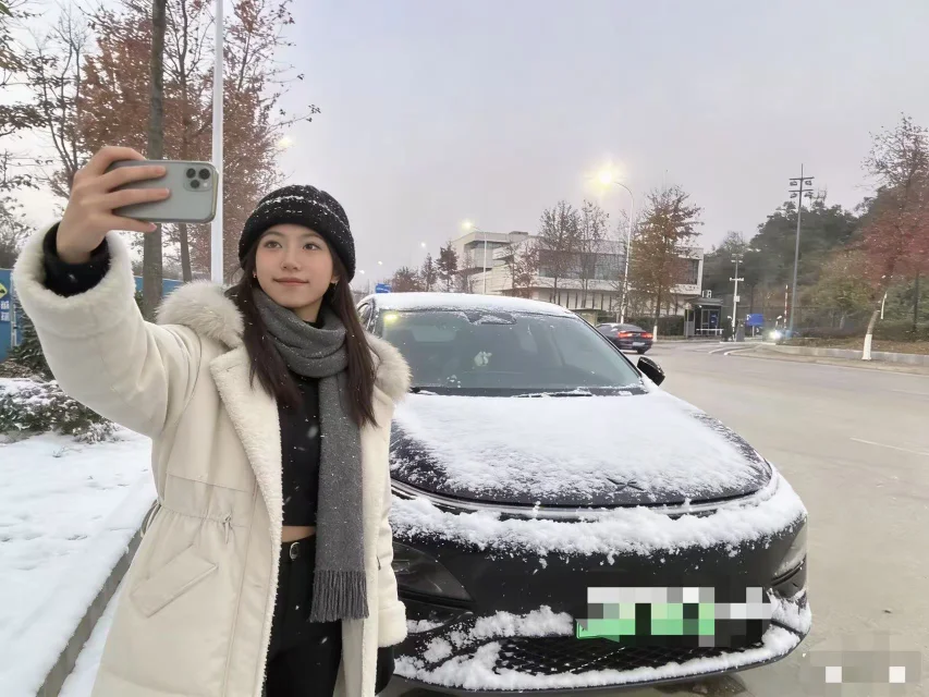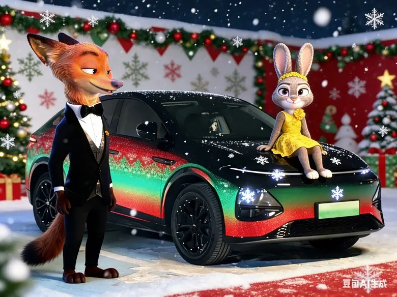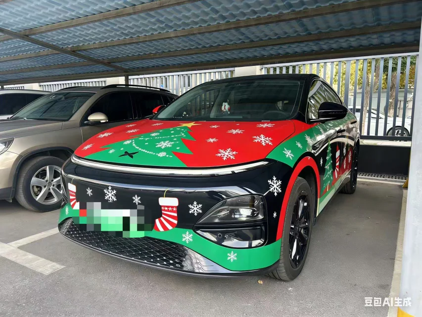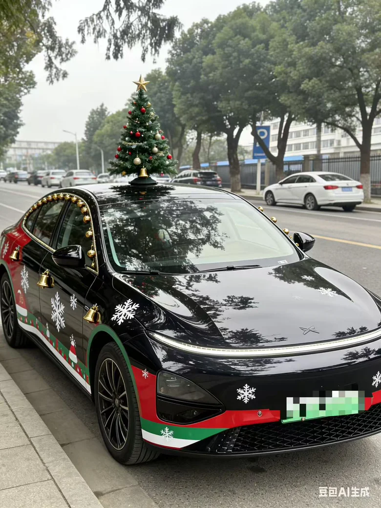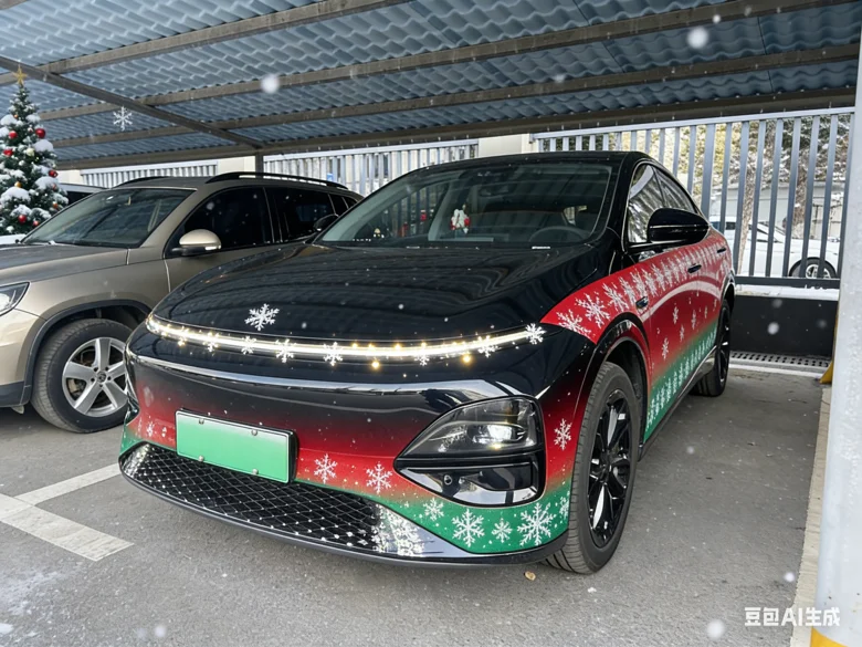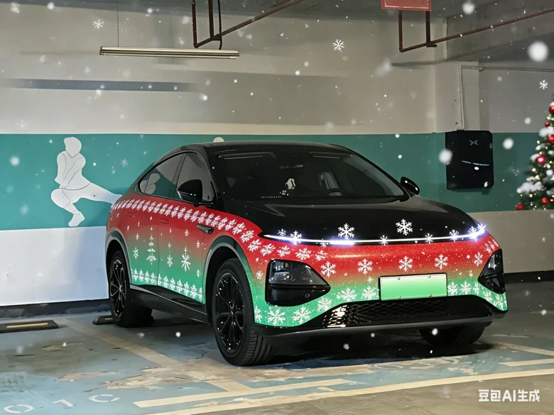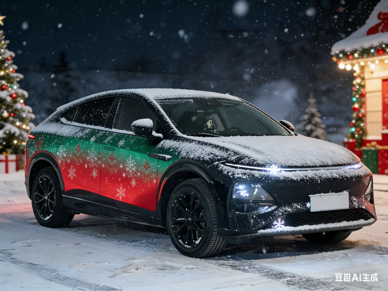 车身侧面是红绿色的圣诞花纹渐变,红得热烈、绿得鲜活,两种颜色自然交融,一点不显得突兀,反而衬得车型线条更流畅利落。前脸点缀了迷你雪花灯效,星星点点的光芒柔和又灵动,仿佛藏着细碎的浪漫。特意让AI给车牌打码,还加了漫天飘雪的圣诞场景,写实的涂装质感配上纷飞的雪花,氛围感直接拉满。