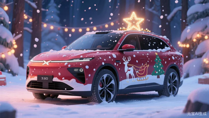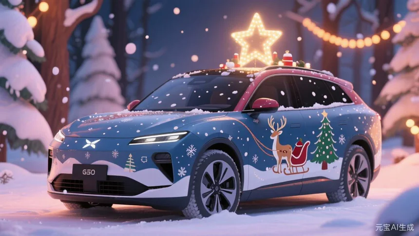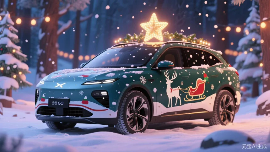 #我的圣诞魔力座驾# 圣诞即将来临,小鹏G9 SUV披上了节日盛装:车头绘有麋鹿拉雪橇的灵动图案,车身飘落着晶莹雪花与圣诞树剪影,车顶装饰着闪耀的发光圣诞星。背景是宁静的雪地森林,暖黄色节日灯光点缀其间,营造出温馨欢快的3D卡通风格场景,完美融合科技与圣诞魔力。