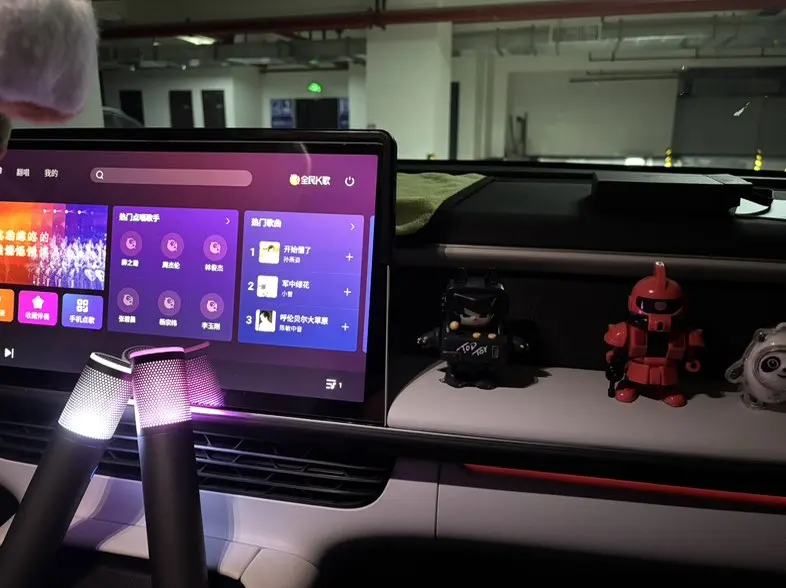 打开车机里的K吧,连上商城买的光连麦,秒变ktv~