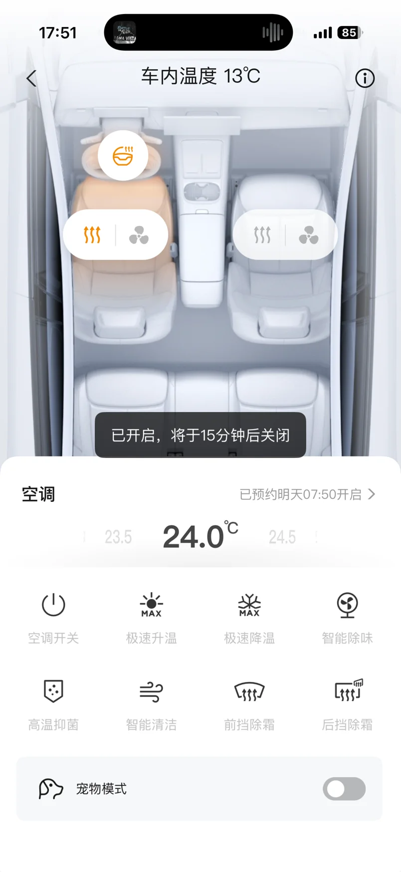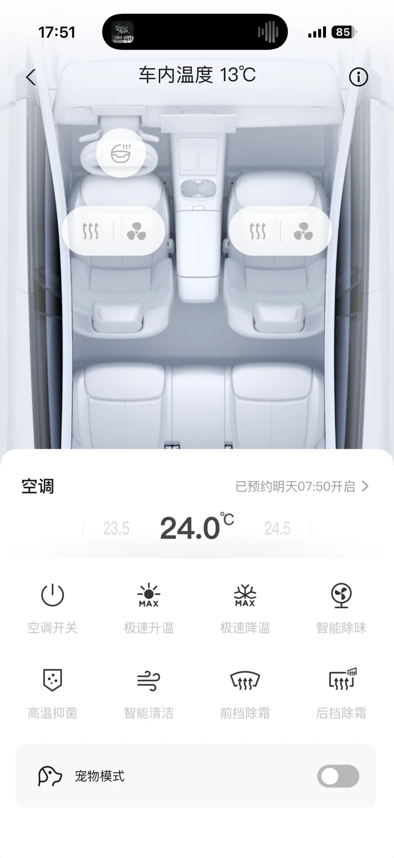 可早上出门开车就没这么舒坦了——我家是地上车位,不比车库暖和,前几天没摸清门道,一拉开车门,寒气直往骨头里钻,方向盘冰得不敢碰。好在小鹏G6的预约功能救了急,现在每天上班前10分钟,我在APP上提前预约空调,再点开方向盘加热和座椅加热。等下楼拉开车门,暖气裹着热乎劲儿扑面而来,方向盘暖乎乎的,座椅也暖到腰背,再也不用硬扛那阵刺骨的冷。