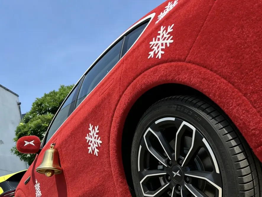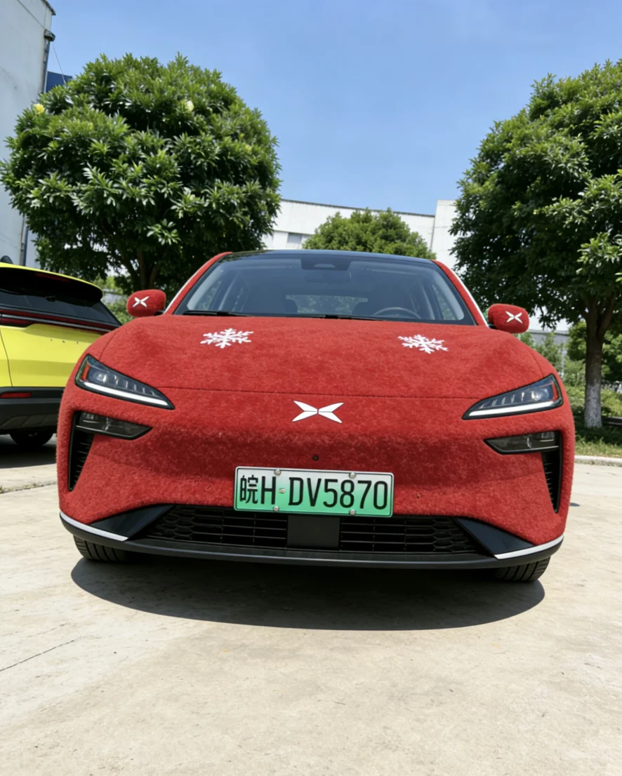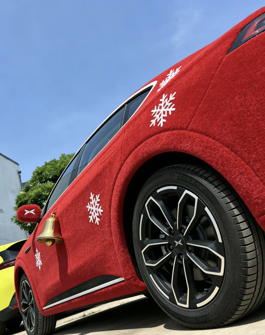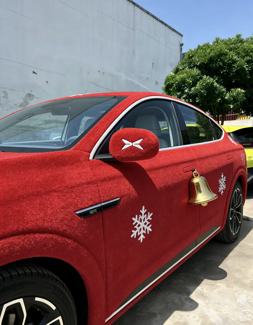 蓬松的酒红长绒贴合车身曲面,车门挂着圣诞小铃铛🔔,车身贴着圣洁的雪花❄️,藏在轮毂与车头的X标是小鹏专属的小彩蛋,开着它穿梭圣诞街头,连风都带着甜暖的节日气息。