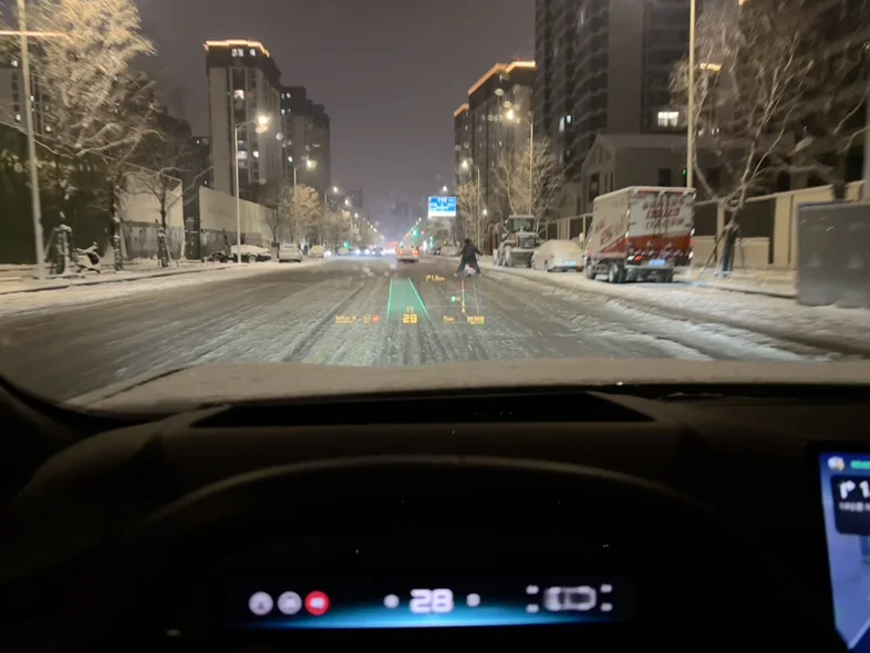 到晚上路上有点滑,忘记提前开雪地模式,平时没用过,不知道怎么手动开启,直接喊小p打开雪地模式,这个时候体现到了语音助手的重要性,同时让小p打开了除雾,HUD也有颜色的变化,视觉体验也让人更舒服,眼前一亮的感觉。由于路滑一路上心里有点紧张,不过车子还挺稳当,真不错!
