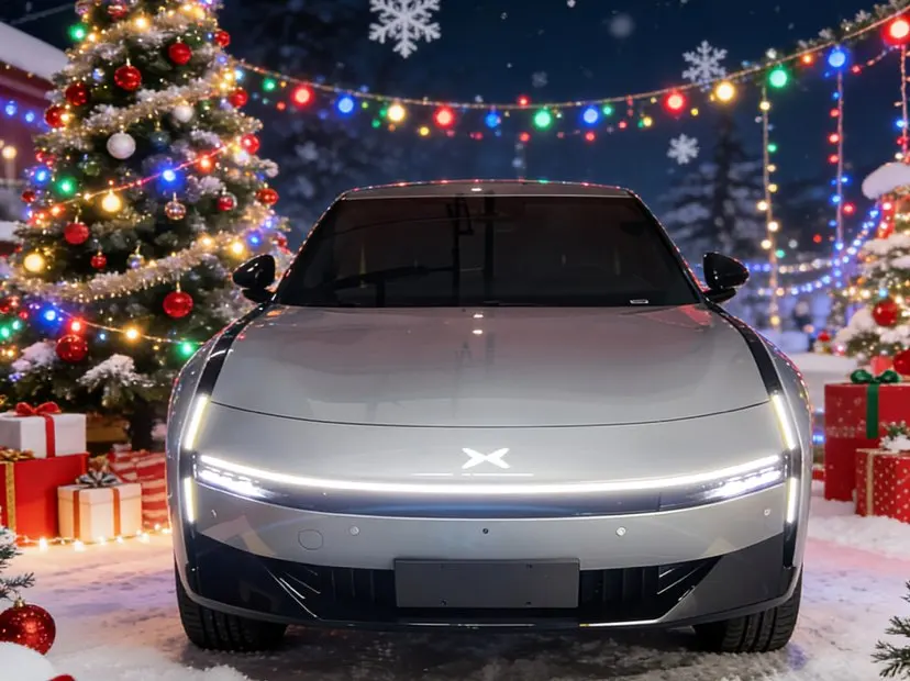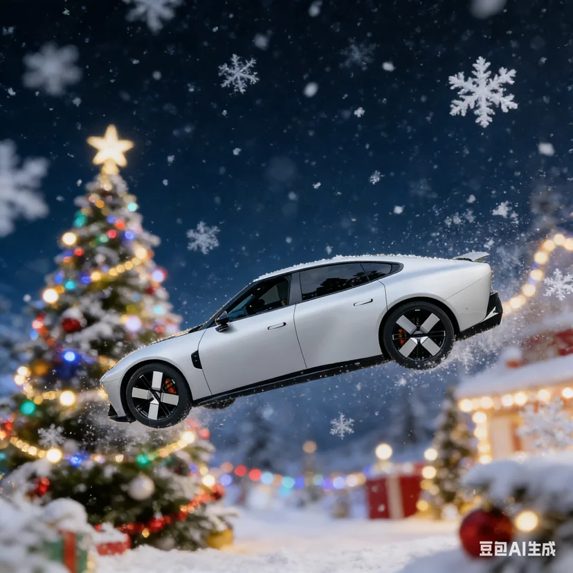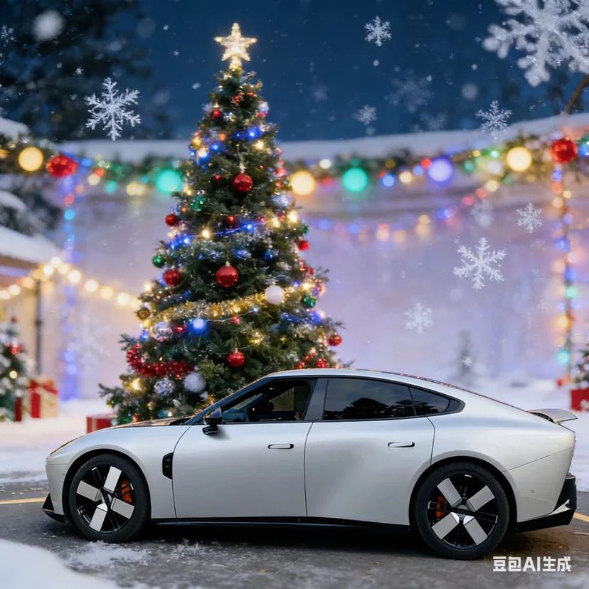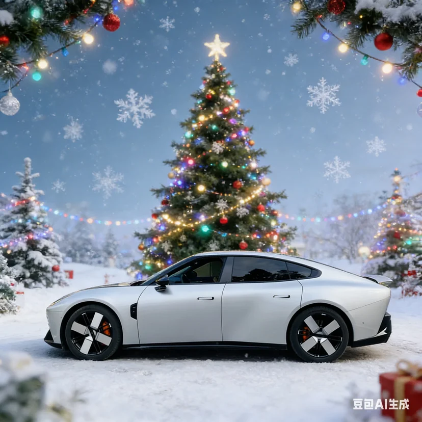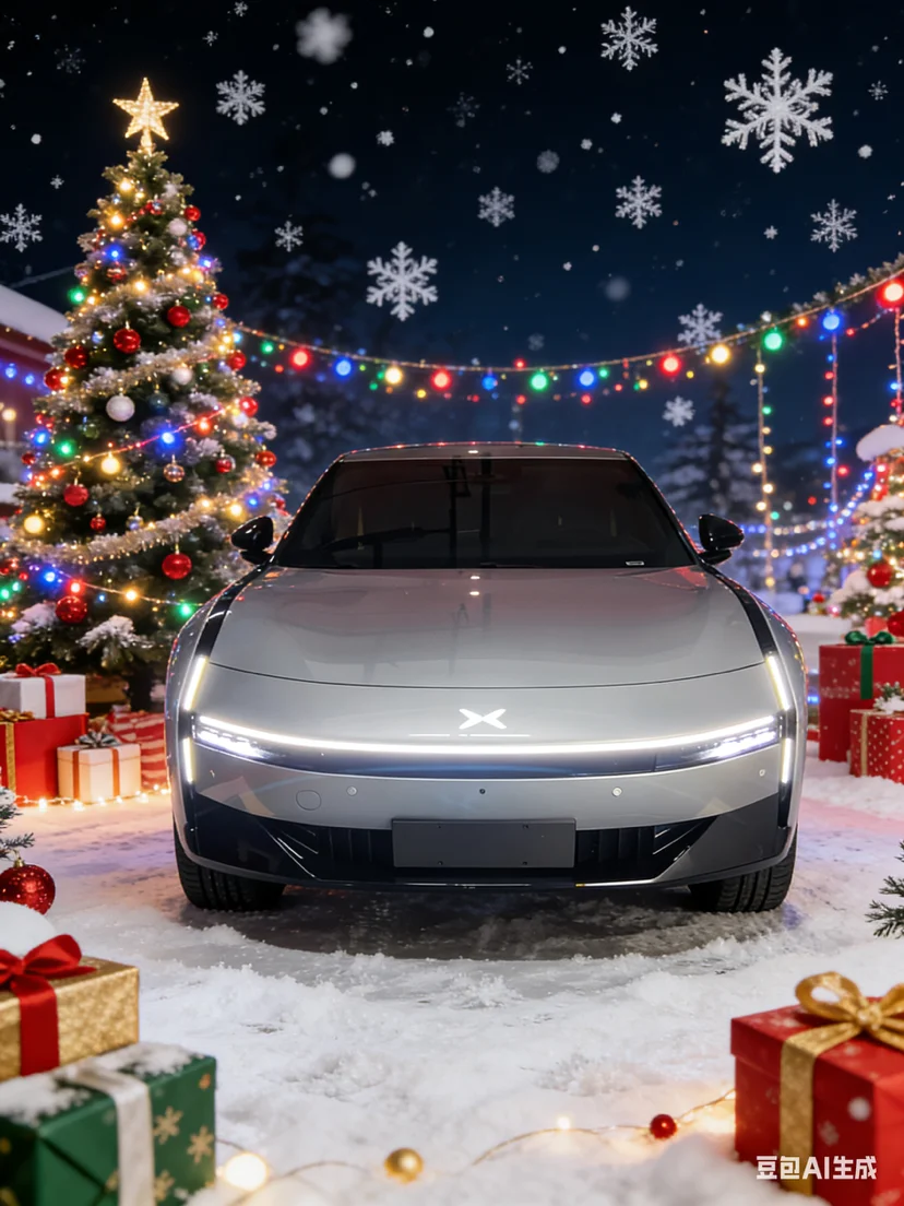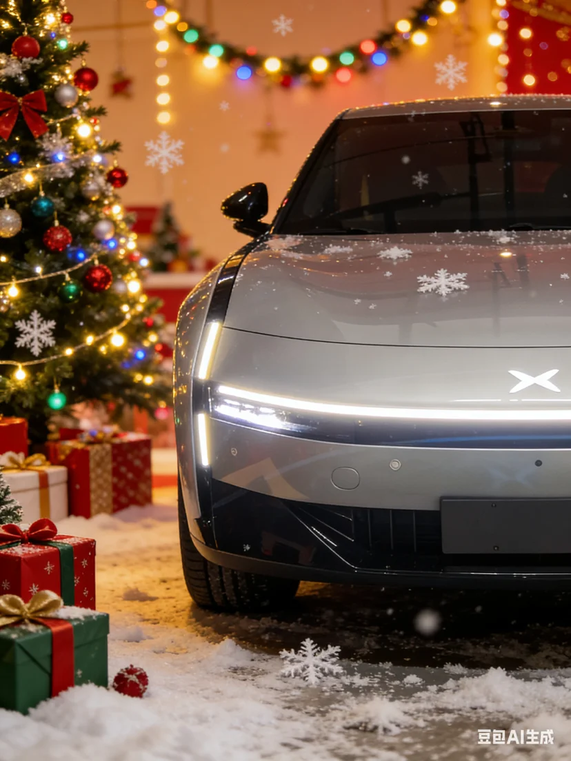 车旁的圣诞树上挂满了红金相间的装饰球与麋鹿挂饰,松枝上的积雪轻轻落在小鹏P7的车顶,与车身的哑光银灰形成冷暖交织的视觉反差。打开车门,车内的氛围灯自动切换成圣诞红与松枝绿的渐变模式,中控屏上跳出圣诞主题的动态壁纸,搭配香氛系统释放的雪松与肉桂香气,瞬间将节日温馨感拉满。