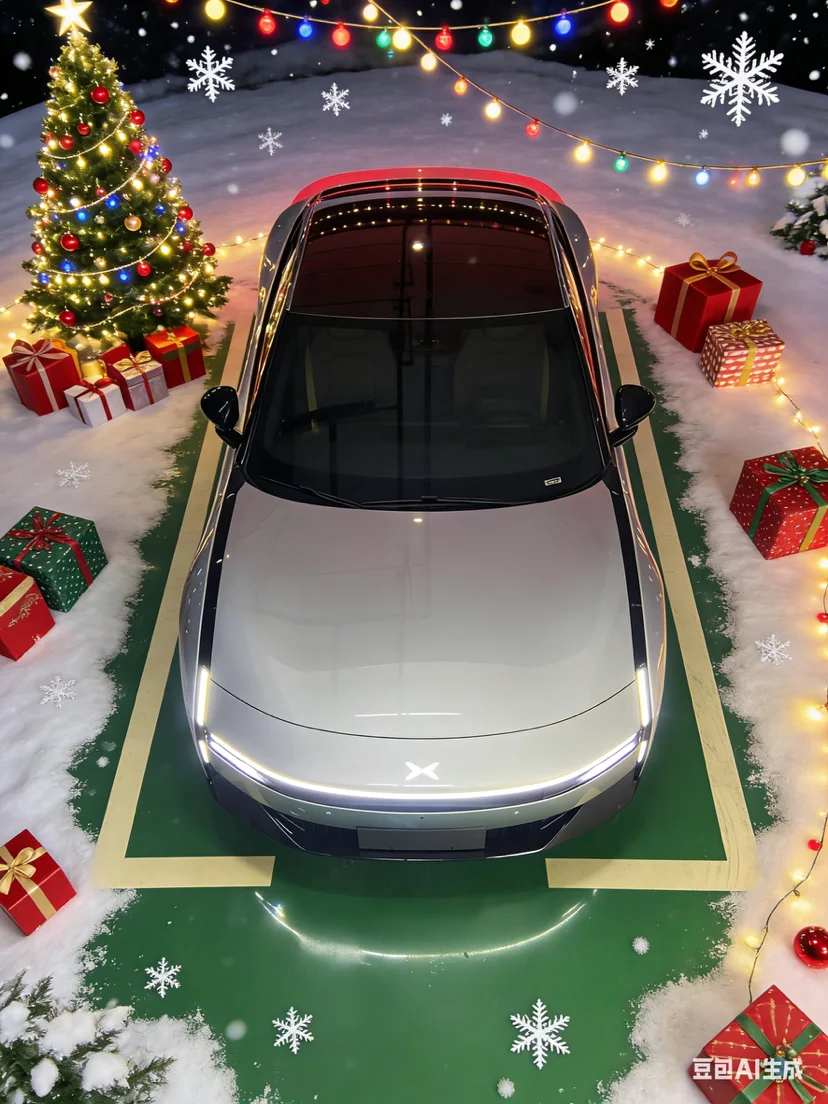 停在铺满彩灯的广场旁,小鹏P7的智能泊车系统精准停入圣诞装饰环绕的车位,自动泊车的流畅姿态与周围的节日布景相映成趣。车顶的全景天幕外,雪花缓缓飘落,透过玻璃看出去,圣诞市集的霓虹与圣诞树的星光交织,而车内恒温空调营造的温暖空间,让这份圣诞的浪漫多了一份舒适与惬意。科技感与节日氛围的碰撞,让这台小鹏P7不仅是出行座驾,更成了圣诞季里承载美好瞬间的移动浪漫空间。