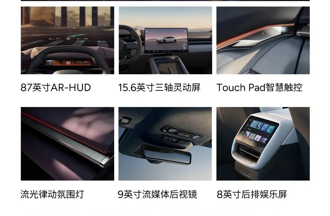 座舱内部有一个大亮点,是一块87英寸的追光全景AR-HUD,它能够把导航路线直接投射到路面上,还有雨雾天气预警等安全辅助功能,开车不用低头,安全感十足。