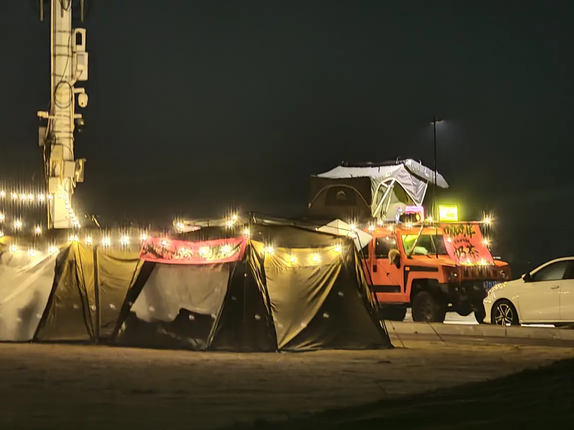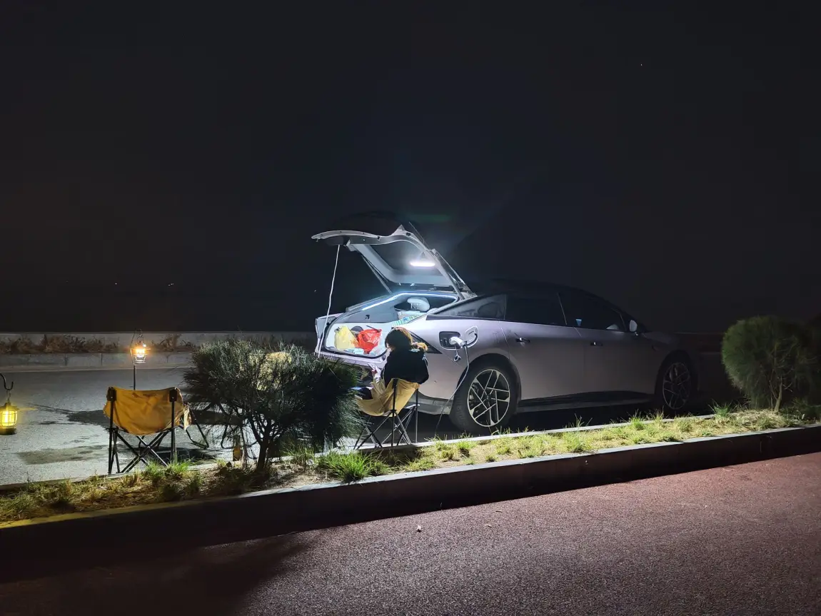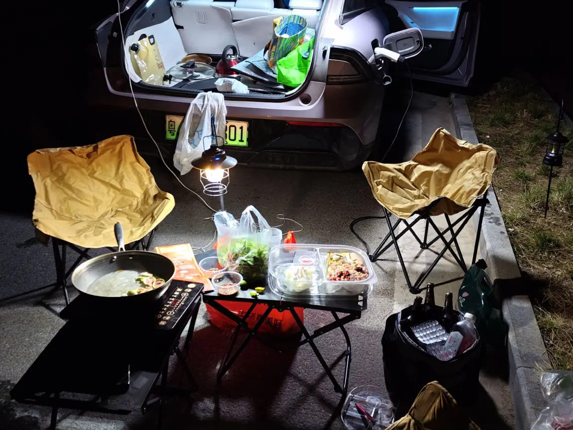 小鹏的后备箱空间超够用,食材、餐具、露营椅一股脑塞进去都不挤,外放电的接口操作也很简单,插上插头就能供电。火锅咕嘟咕嘟煮着羊肉卷,暖黄的露营灯从小鹏后备箱旁垂下来,映着海面的波光,和朋友围坐在一起涮菜聊天,海风裹着凉意吹来,却被这满锅烟火气和小鹏带来的便利暖得透透的。