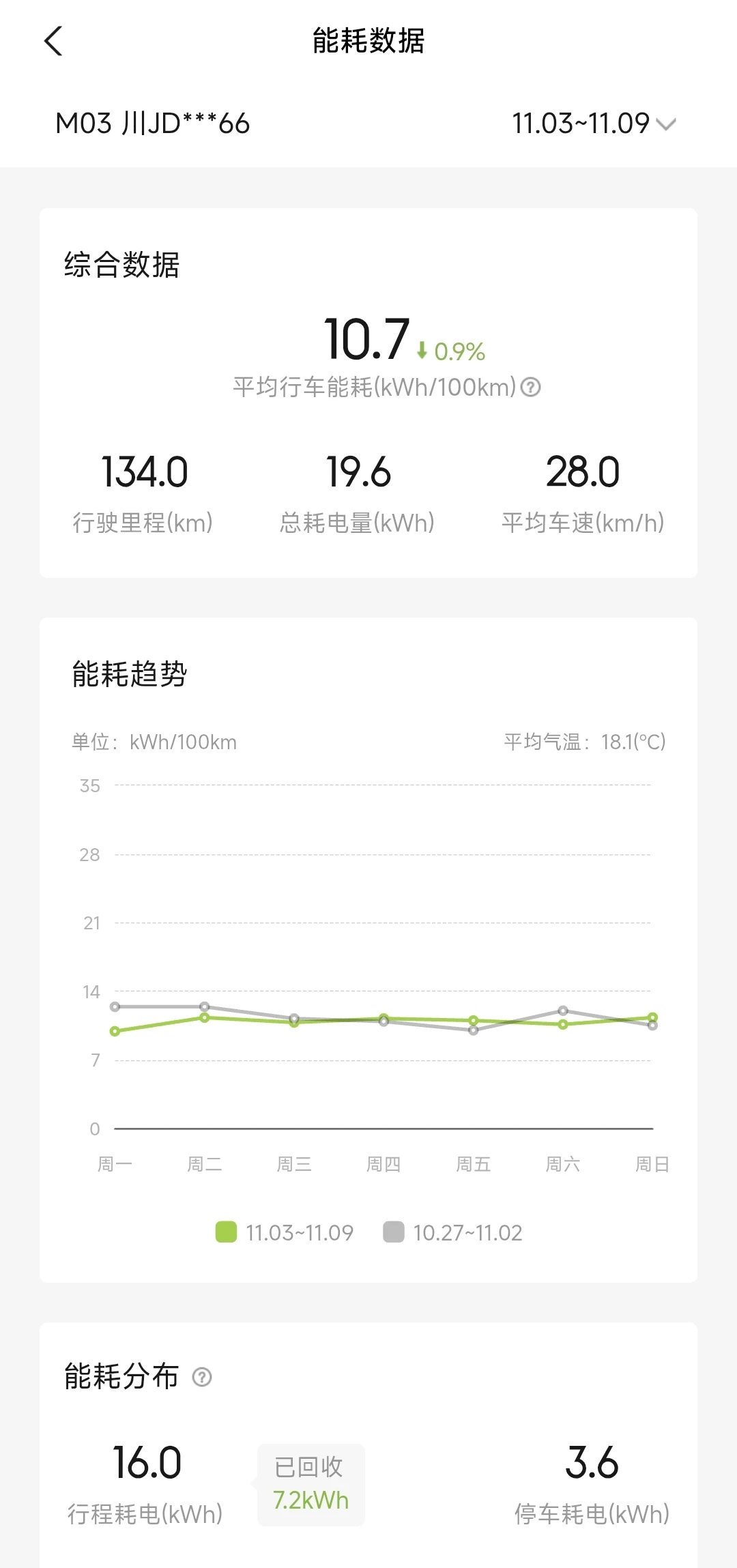 秋日的南昌气温舒适宜人,开车时基本不用开空调,这也让能耗表现格外亮眼。整个11月,能耗稳定在10kWh/100km左右,续航扎实又耐用,彻底打消了我此前的里程焦虑。