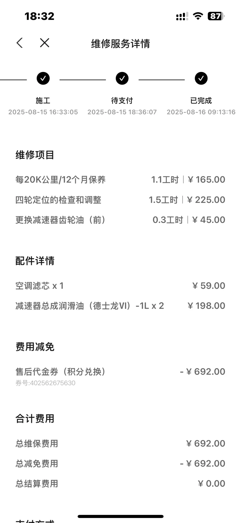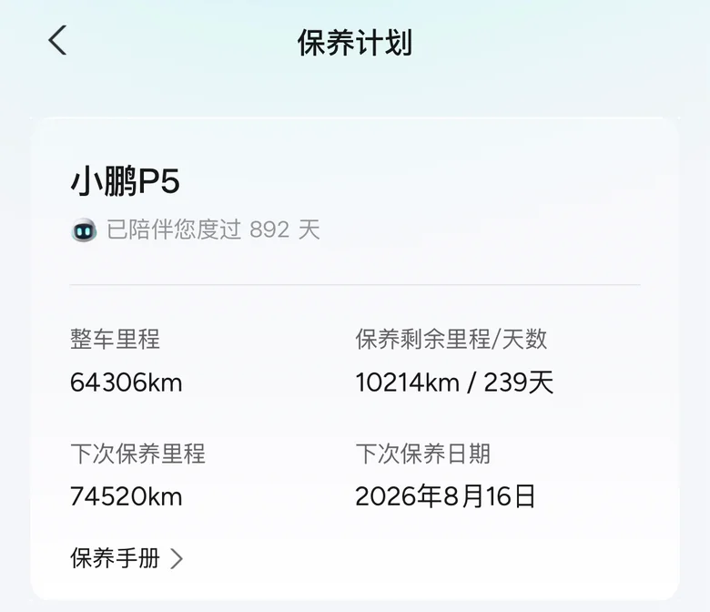 说起保养,从入手胖虎至今,不得不感恩鹏厂的贴心服务,不仅服务周到,甚至推出的积分抵扣保养费用服务真的太香了!这一年来唯一的一次中保养,费用是692元,积分全额抵扣,相当于今年保养花费为0元!做小鹏车主真的很幸福!