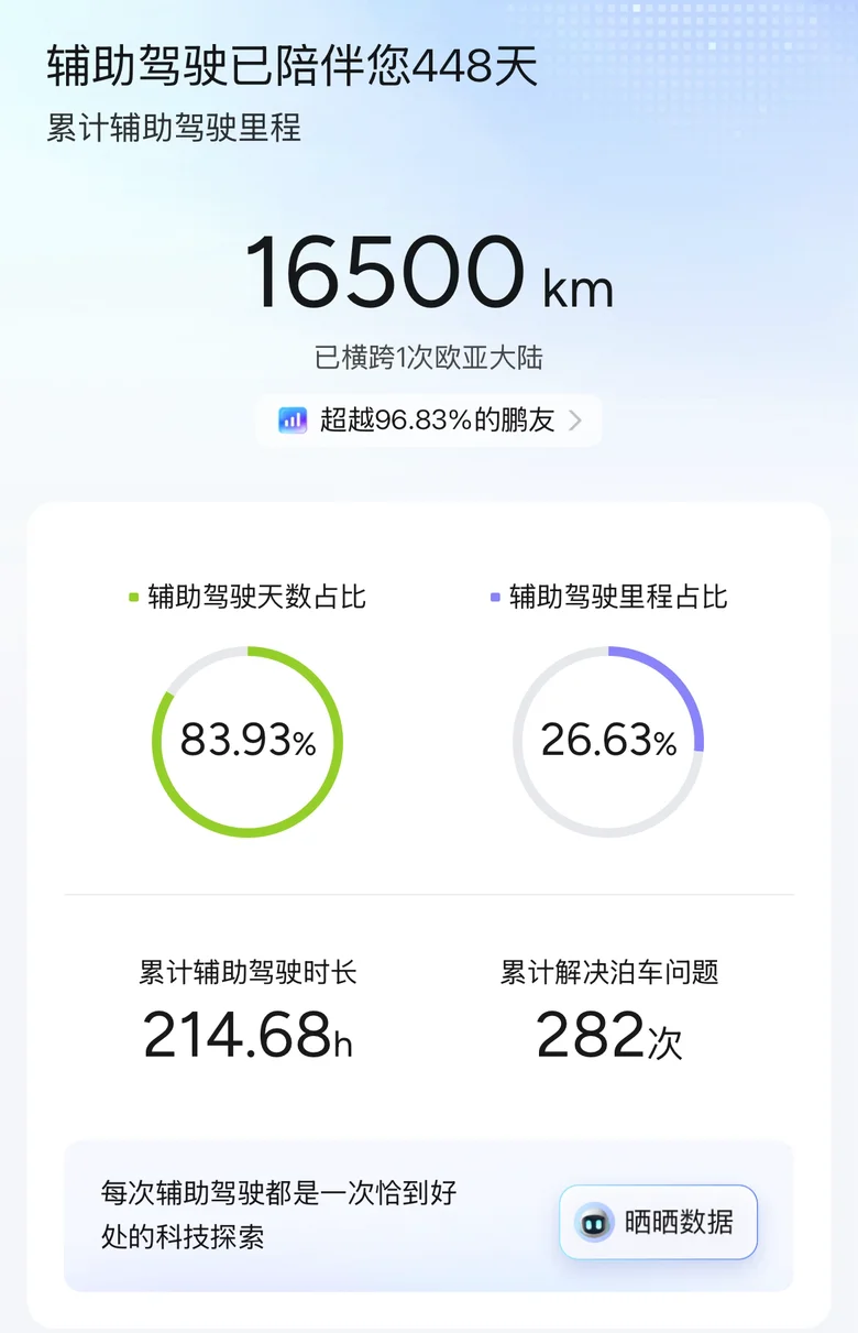 单纯从辅助驾驶陪伴了近450天里,就能知道无论是城市快速路,还是城乡间的高速,有NGP加持的辅助驾驶体验,简直完美!辅助驾驶的天数占就超过了83%,让我的每一次行程都能轻松抵达目的地!智能泊车更是解放双手,我怎能不爱呢?!