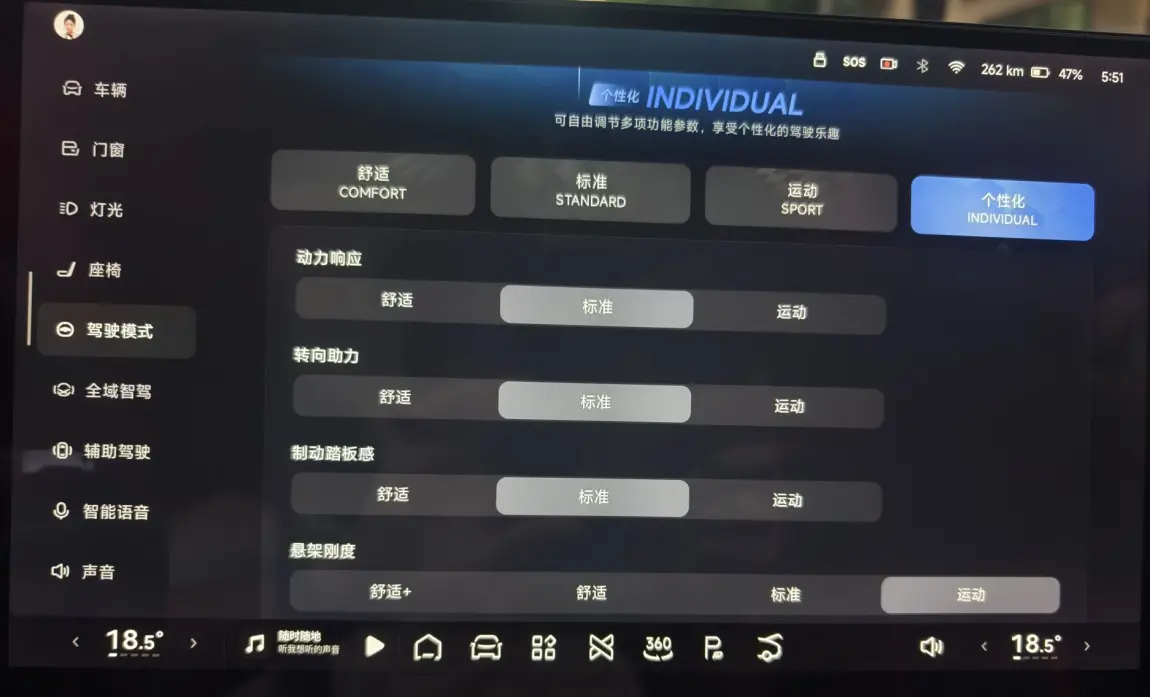 高速稳定强化(≥70km/h):车速超过70公里/小时,系统自动启用“个性化模式”,我手动将悬架刚度调整为“运动”。这样在高速行驶时,车身更稳、侧倾减小,驾驶信心十足,避免软悬挂导致的“飘忽”感。