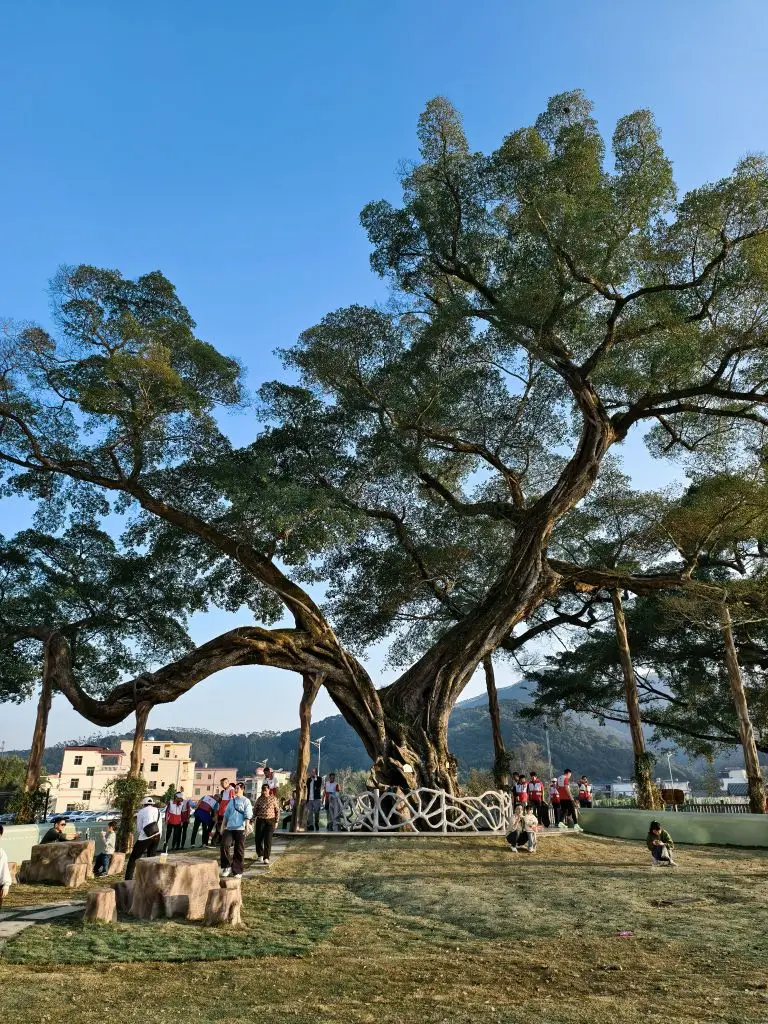 3️⃣下午4点到达千年古树驿站,这个驿站是218公路16个驿站中名气最大的一个,前不久诺贝尔文学奖获得者莫言在这里为古榕文学村揭牌。刚到这里就被这棵“千年树王”震撼到!枝繁叶茂像把巨型绿伞,阳光透过缝隙洒下来超有氛围感。与榕树相对的现代建筑由知名建筑师刘可南设计,与原始村落相映成趣。主办方还准备了精致下午茶,在古树旁喝茶聊天,和鹏友们唠嗑太惬意了。