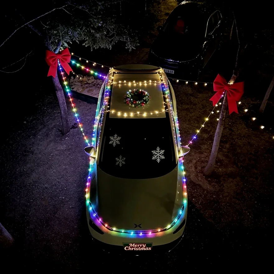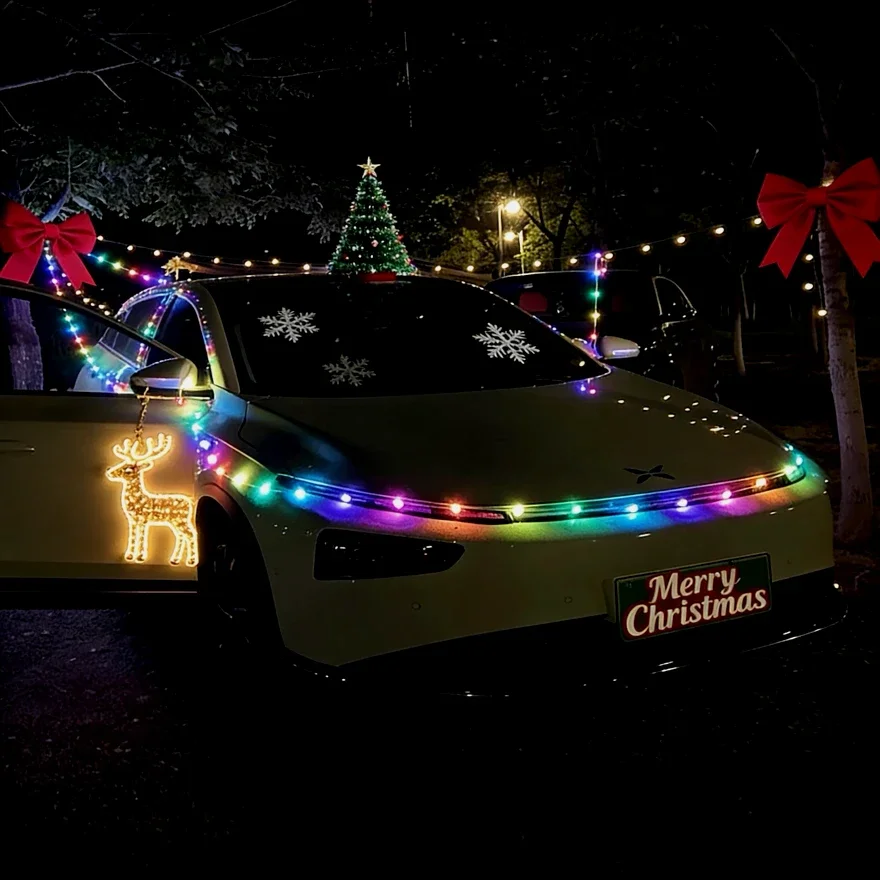 一眼就被装饰满彩灯的圣诞款小鹏惊艳到——车身缠绕着七彩灯带,车门上的小鹿灯牌闪着暖光,前挡风玻璃的雪花贴纸配着车顶的迷你圣诞树,连车牌处都贴着“Merry Christmas”的字样,瞬间把圣诞仪式感拉满~