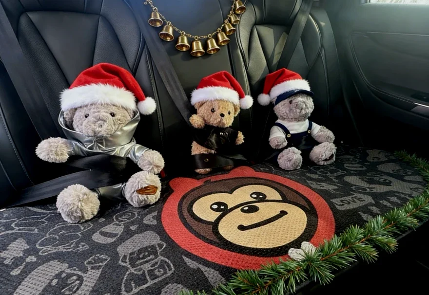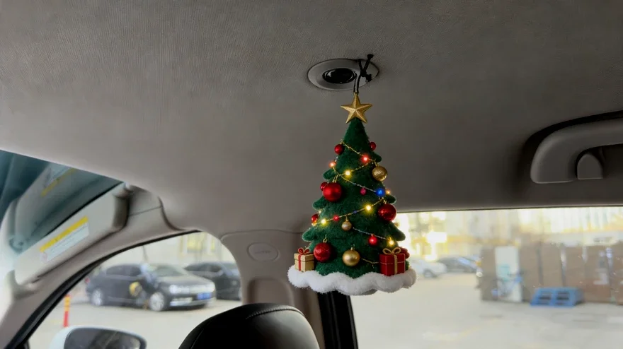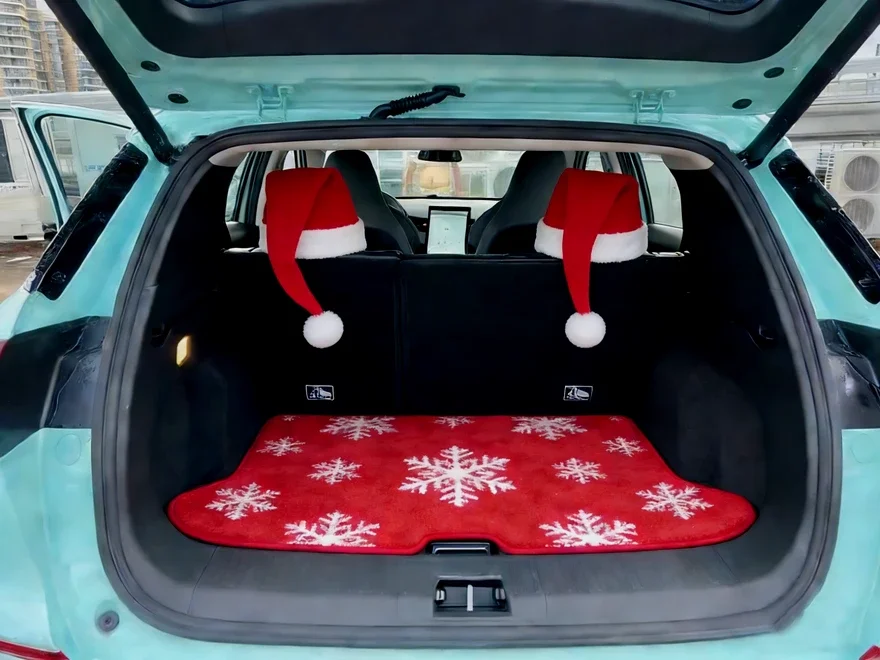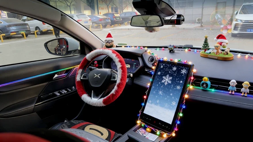 车内的布置则是「沉浸式圣诞座舱」的巧思:用小鹏的语音助手设置了圣诞专属唤醒词,一句“你好小P,圣诞快乐”,车内氛围灯立刻切换成圣诞金红渐变模式,同时自动播放圣诞经典旋律;副驾的储物格改成了迷你圣诞礼物仓,塞满了糖果和小盲盒,打开的瞬间就像拆圣诞惊喜;后备箱更是藏了彩蛋,铺了一层仿真雪绒垫,摆上发光麋鹿摆件和小鹏定制的圣诞抱枕,打开电动尾门的那一刻,就是一个移动的圣诞小角落。