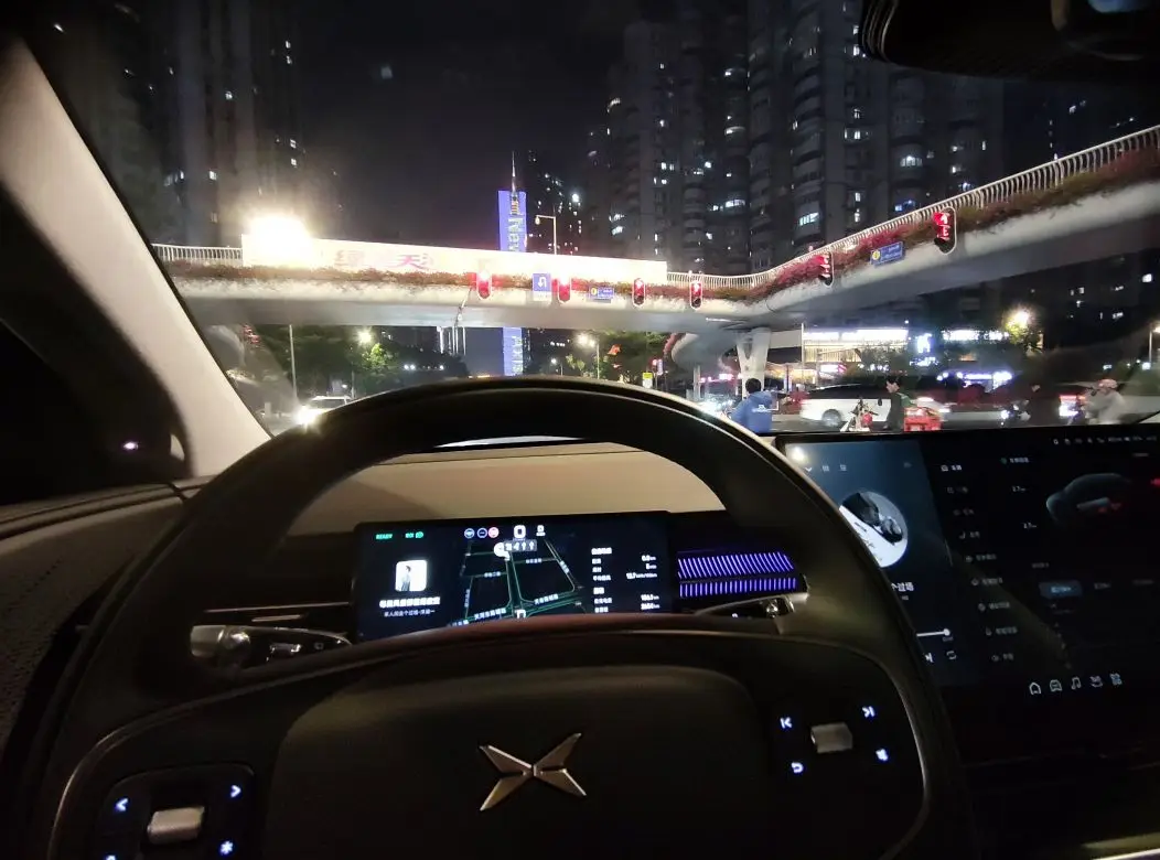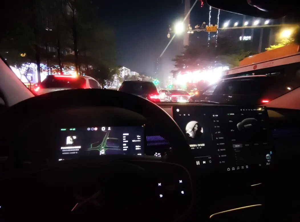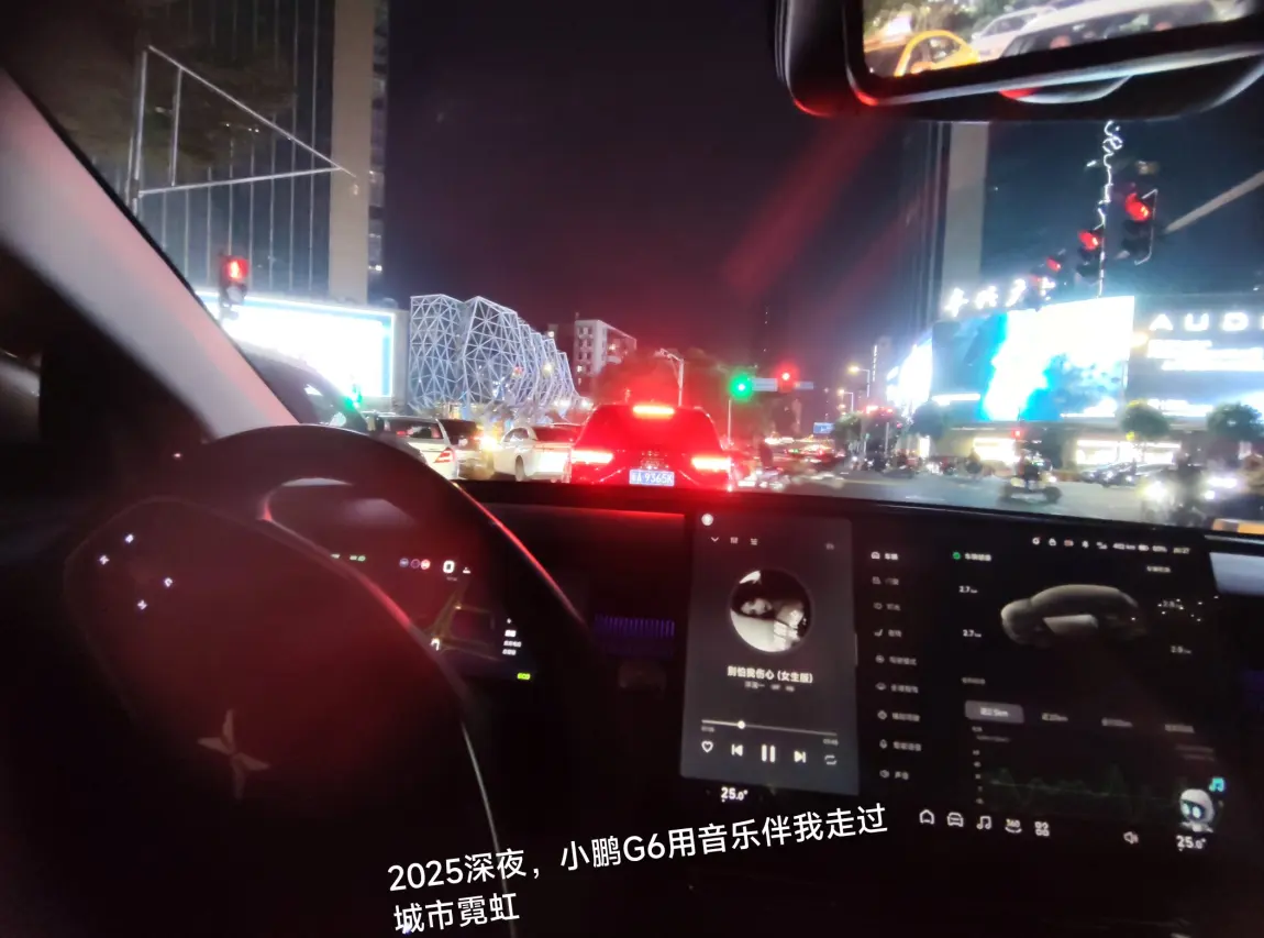 城市深夜的车厢里,霓虹透过车窗映在中控屏上,音乐流淌间,小鹏G6载着我穿过车流。方向盘的小鹏标在夜色里发亮,这张车内视角的照片,记下了无数次夜归的安心。