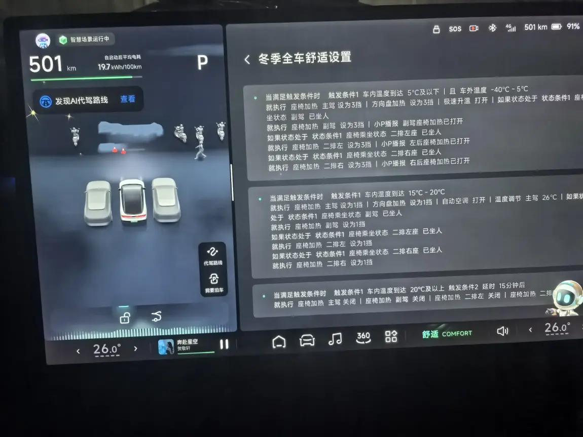 3️⃣让我“懒”并快乐着的功能种草:如果说出行拓展了边界,那么车内的智慧功能则提升了每一段旅程的品质。2025年,我最想“种草”的功能是 “自定义智慧场景”和“静谧空间”。一是各种智慧场景,扩展了用车感受,方便了使用体验,比如洗车模式、充电模式、离车自动开启哨兵等,我还自己设置了一个“冬季舒适用车”,第一次去弄这个还在一点点摸索,试用中还有点小问题,正在一点点摸索改进。再就是“静谧空间”,一次等人的时候偶然用了一下,躺平、播放大自然的音乐,瞬间感觉等人也是种享受了,尤其是下班后,到家里楼下,先打开“静谧空间”在车里躺上二十分钟,顺便打开按摩,最后以一个美好的心情进家门,一个字—绝。