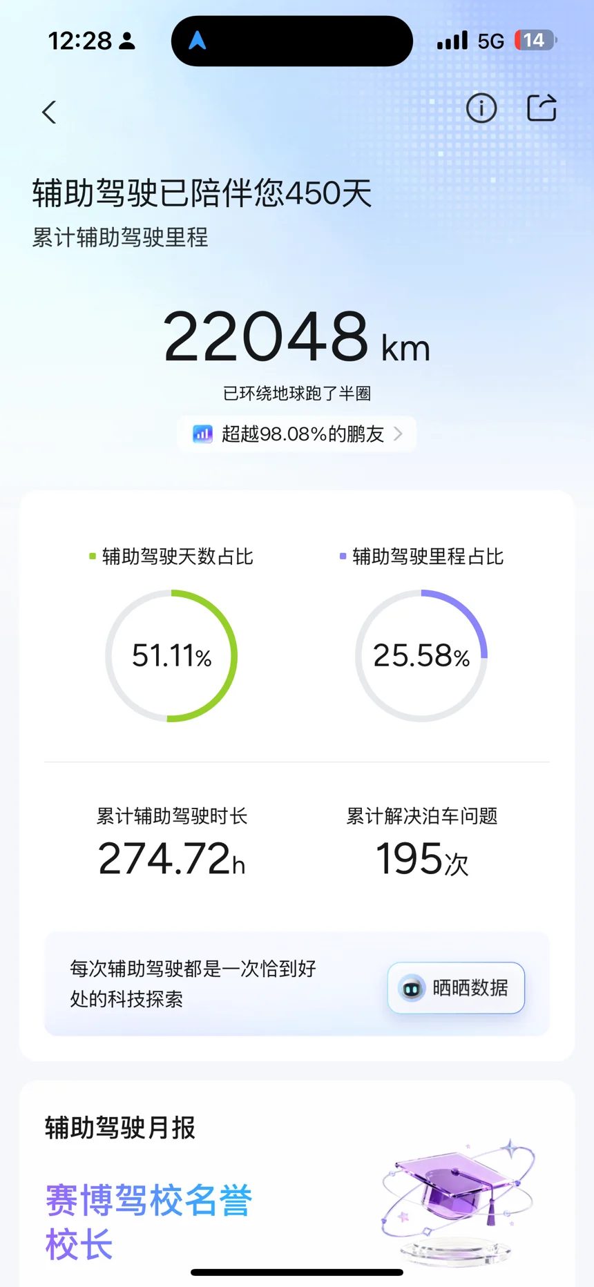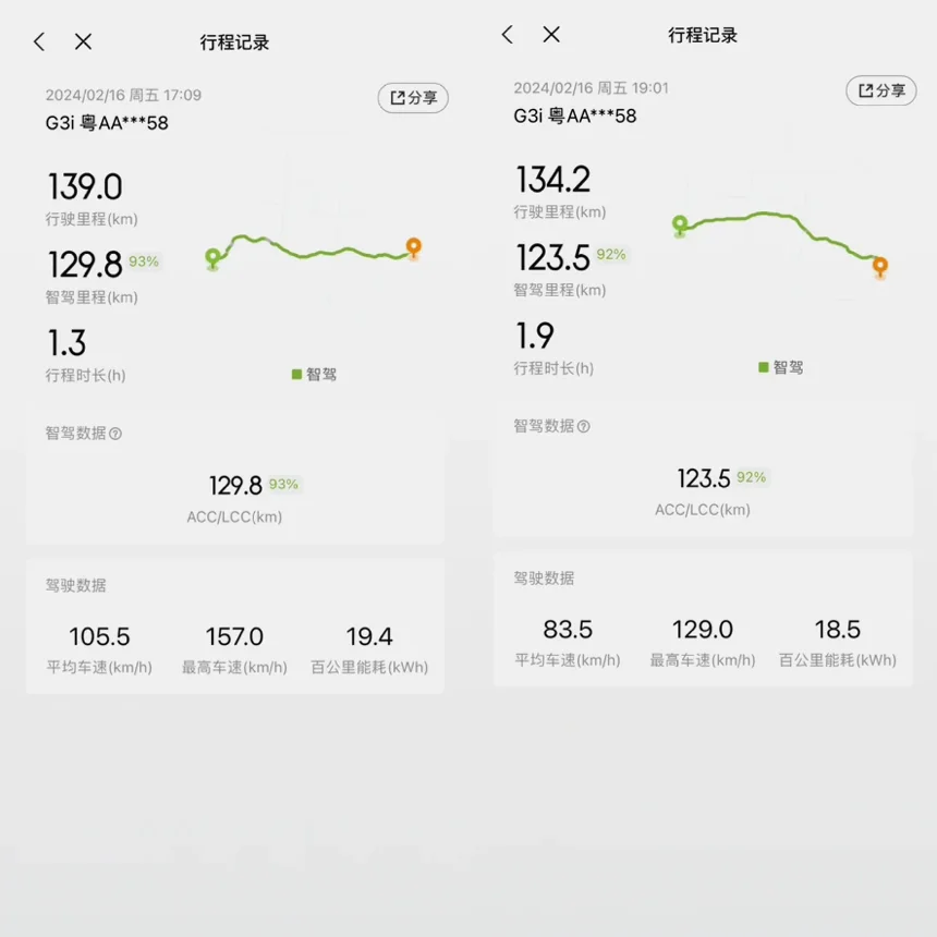 占比巨高的辅助驾驶里程,是每一次和小P出行的乐趣,从起点到终点,从黄昏到黑夜都有着小P的存在。