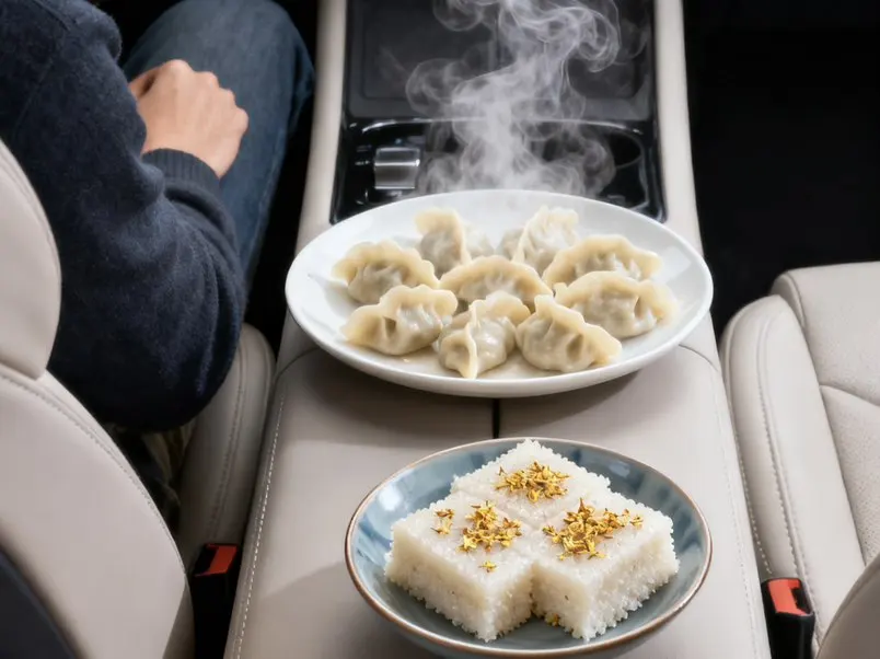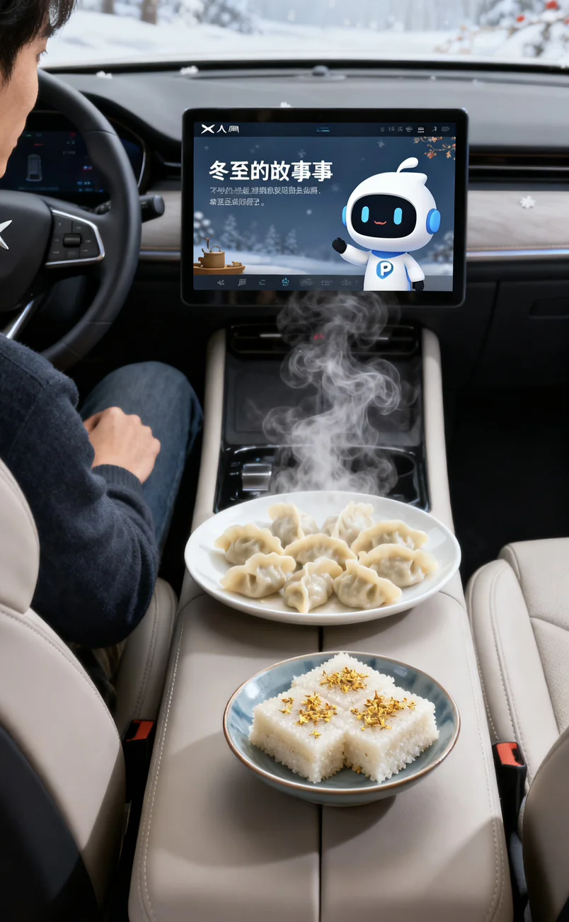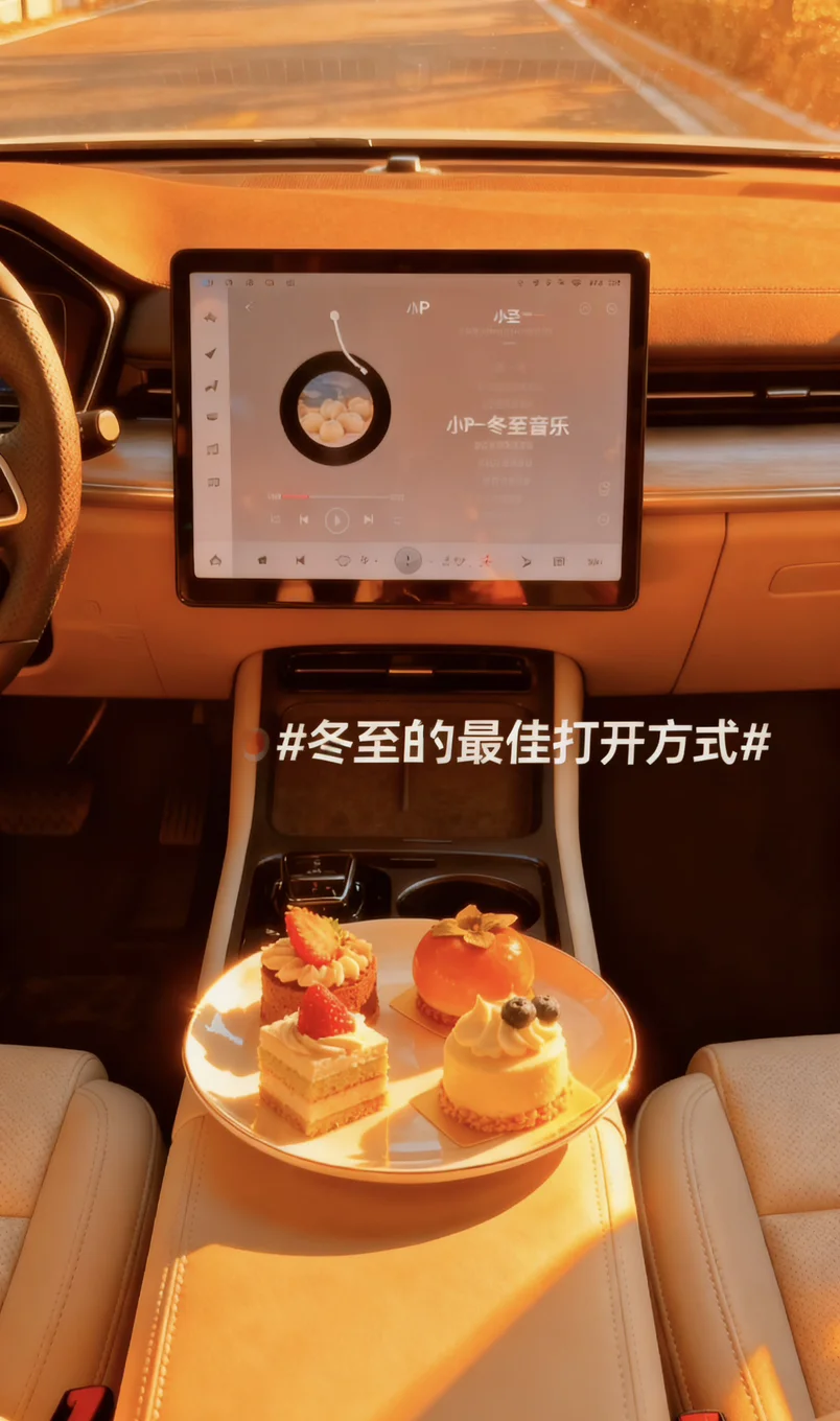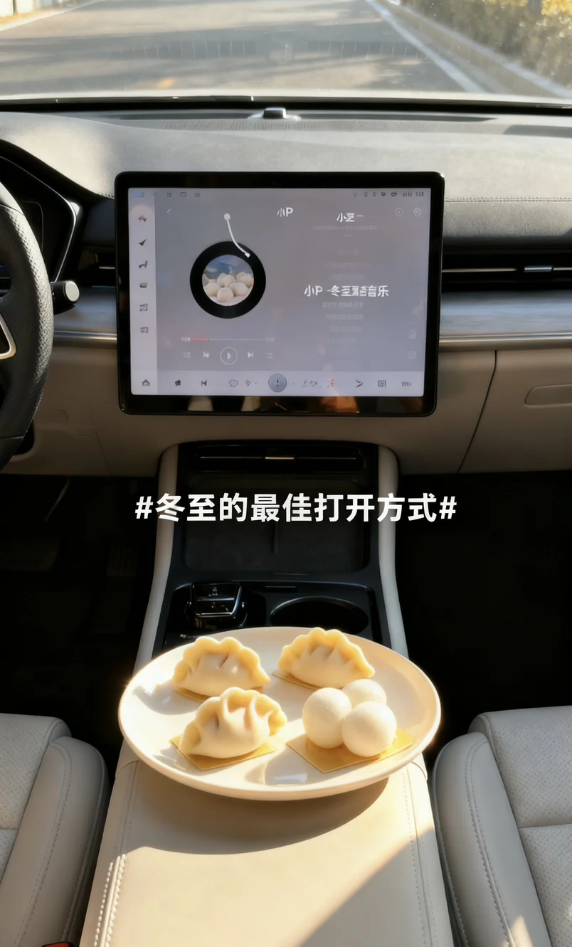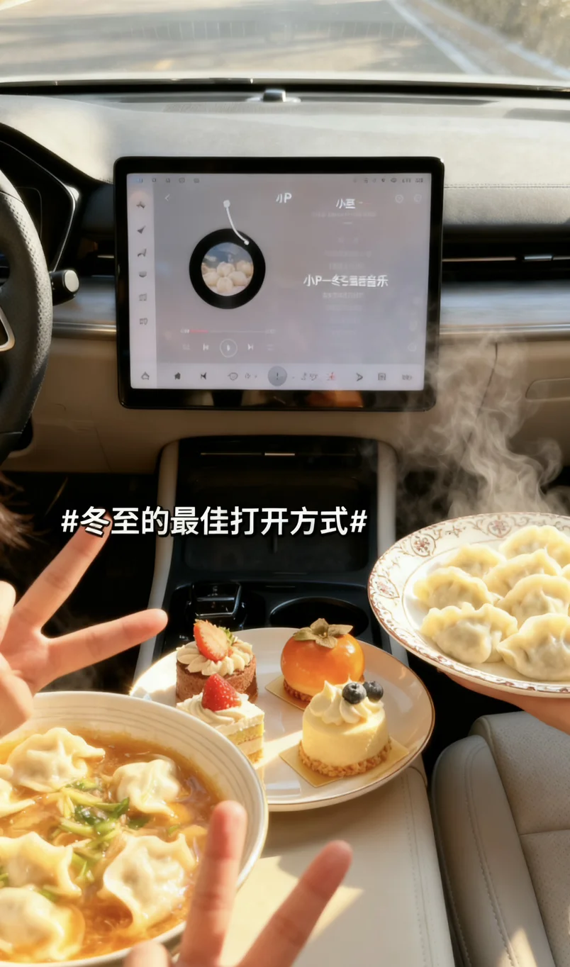 😘冬至这天特意把小鹏车内布置了一番,👧暖光氛围灯开起来,摆上刚煮好的冬至饺子、甜滋滋的桂花米糕和双酿团,😋还让小P给我讲了冬至吃饺子的民俗故事。👏捧着热乎的小食靠在座椅上,和小P对着镜头比耶合影,小小的车厢里飘着食物的香气,听着小P软糯的讲解声,💁原本冷冷的冬至,👼因为小鹏的陪伴变得满是暖意。原来冬至的仪式感,不一定需要热闹的场合,在自己的车里,✌和智能伙伴一起分享节气小食,记录这些细碎的美好,就足够治愈整个冬天啦~#冬至的最佳打开方式#