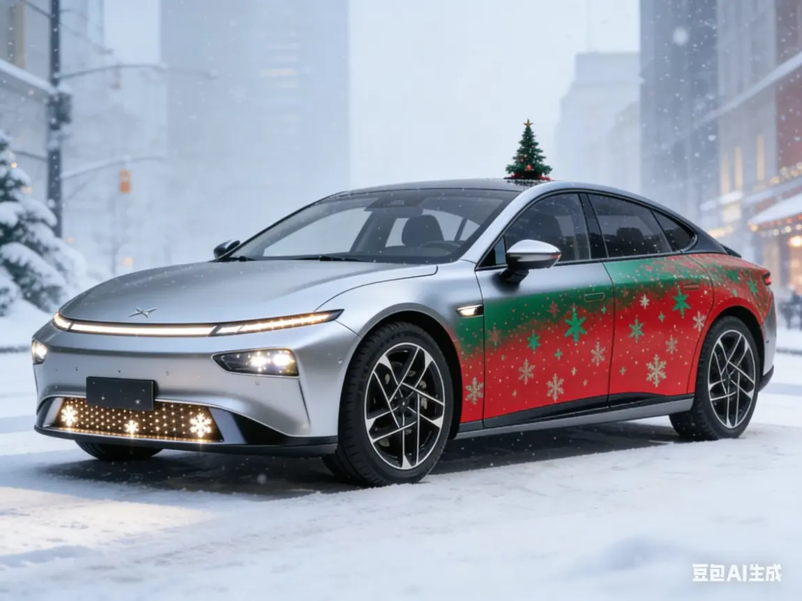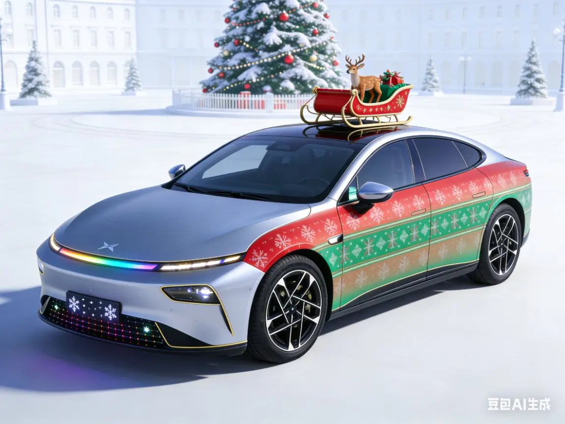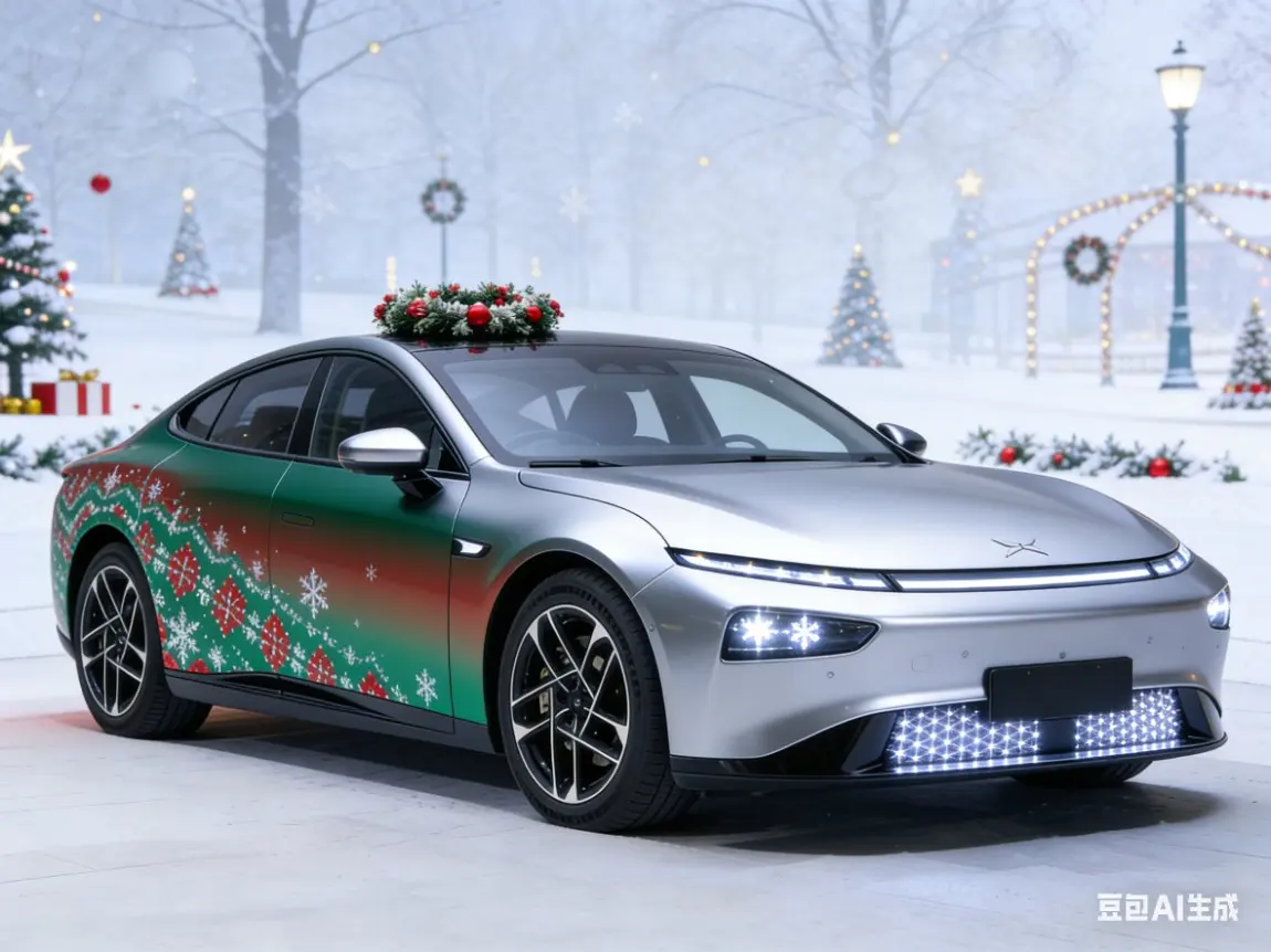看着我的银色小鹏P7+换上圣诞新装,哑光银车身缀着红绿色的圣诞花纹渐变,前脸格栅的迷你雪花灯效一闪一闪,车顶的小圣诞树摆件摇摇晃晃,瞬间觉得2025的收尾满是暖意。