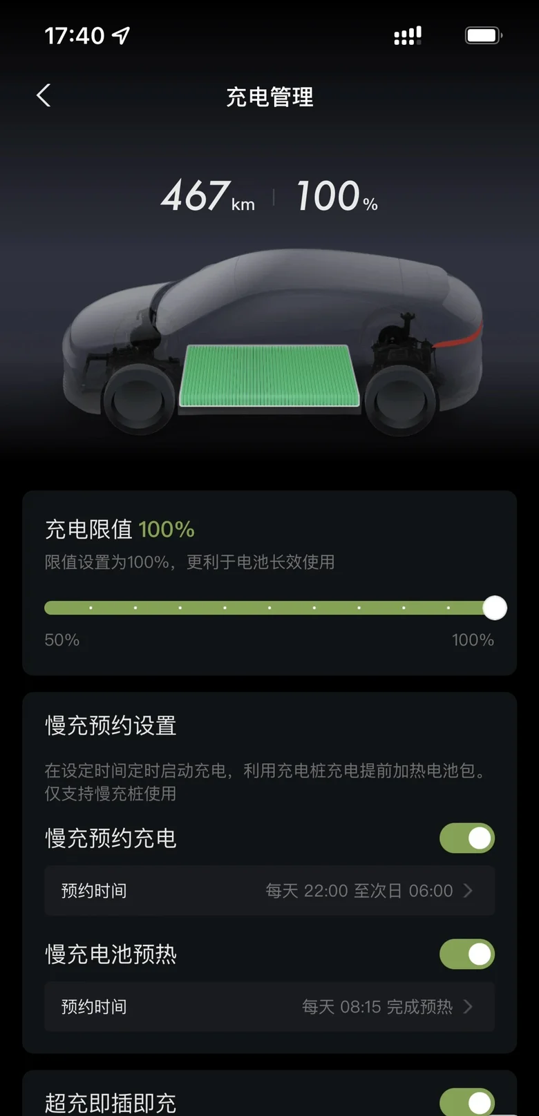 电池以及补能,快充前通过小鹏APP提前15-20分钟开电池预热,让电池达最佳工况30%-80%快充最快仅需20多分钟,补能效率大幅提升。