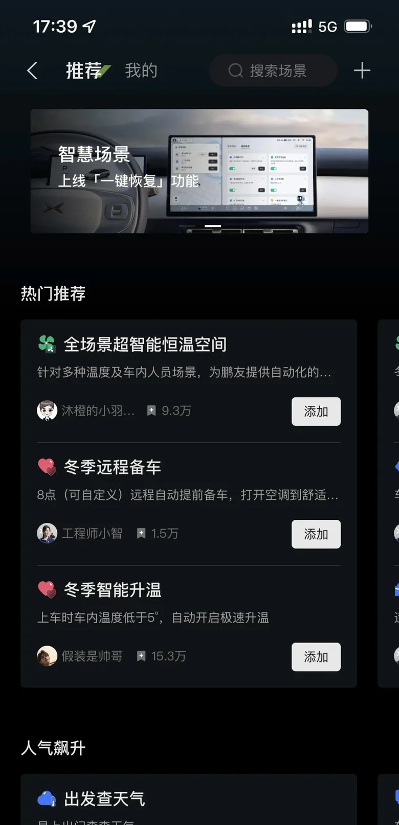 智慧场景“冬季远程备车”和“冬季智能升温”,这两个特别好用,上车就能享温暖。小鹏APP进入智慧场景的自定义页面,触发条件选“定时时间”(如上班前15分钟),执行动作设置成“车内温度<15℃时,开启极速升温、主驾座椅+方向盘加热、空气净化”,还能勾选“15分钟后自动关闭场景”,避免过度耗电,适配自己的出行节奏。
