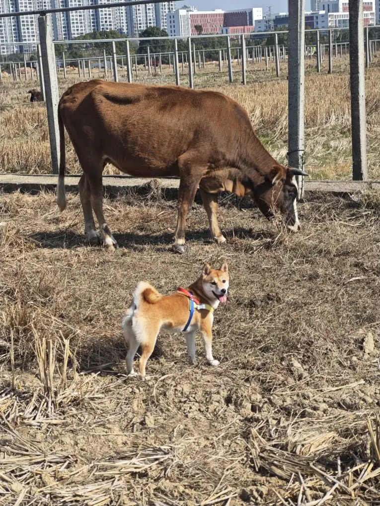 到了公园,虽说是公园实际上是大学生们的实验基地,解了绳子,俩狗子一下车就撒了欢,疯狂的上演你追我跑的戏份、踩干枯的稻草。跑着跑着,小柴犬突然定住了,原来前面草地上拴着一头老黄牛。它也不怂,颠颠地跑过去,歪着脑袋瞅人家,我赶紧掏出手机拍照,这家伙居然还对着镜头咧嘴笑,那傻样儿太逗了。