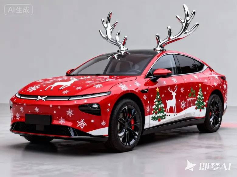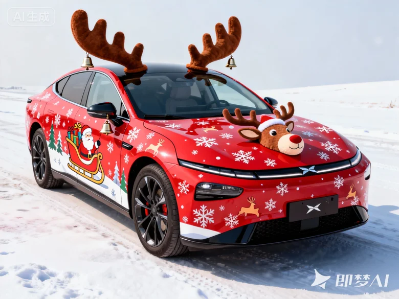 车身底色有两款,一款以红色为主,一款以红绿渐变色为主,配上圣诞代表物件雪花、麋鹿,车身以圣诞老人和圣诞树为装饰,车顶添加麋鹿鹿角(既有金属风的银色,也有可爱风的棕色毛绒),左右两边后视镜各挂有一个金🔔