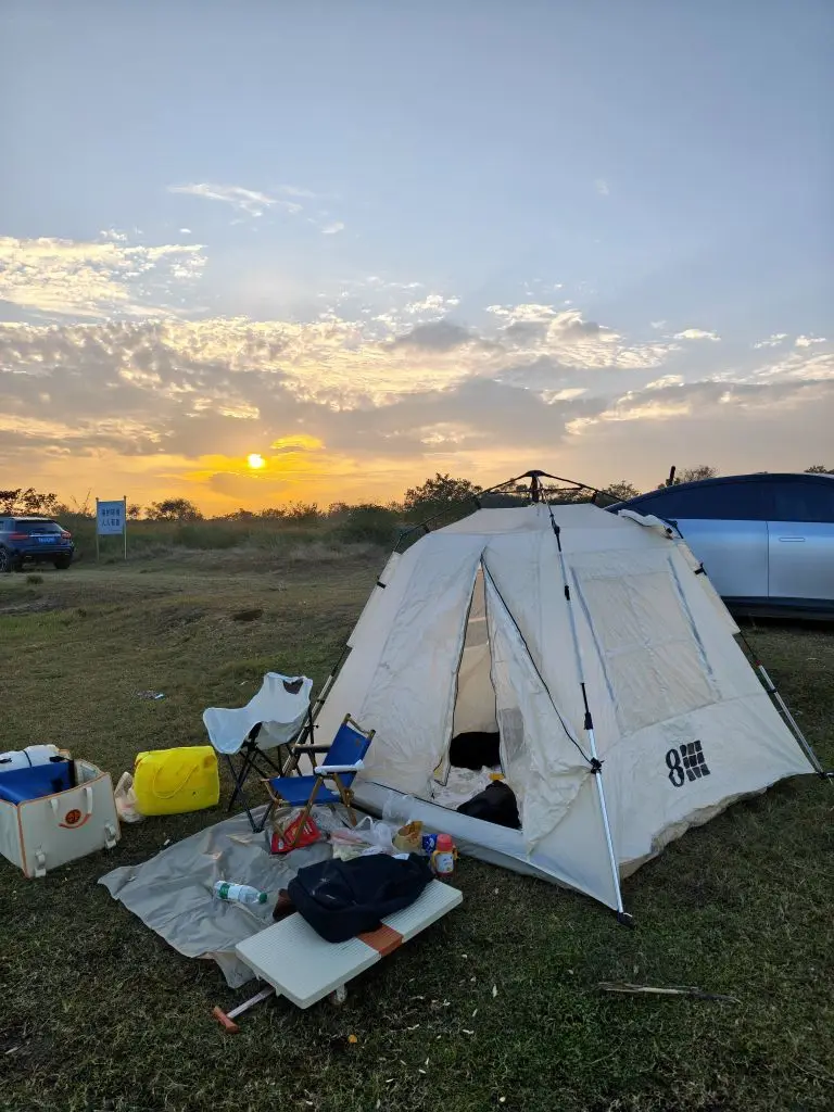 我们在车旁搭起帐篷,我和爱人在草坪上漫步,随后煮着咖啡,听着风吹过树叶的声响,看晚霞漫过车顶。夜色渐浓时,打开全景天幕,漫天星光尽收眼底,车内柔和的氛围灯与星光交映,此刻的宁静与惬意,足以消解一整年的疲惫。