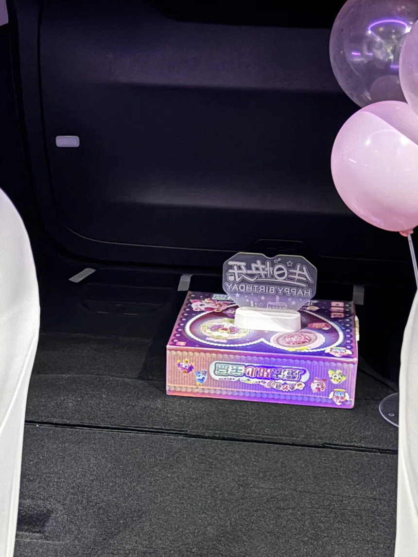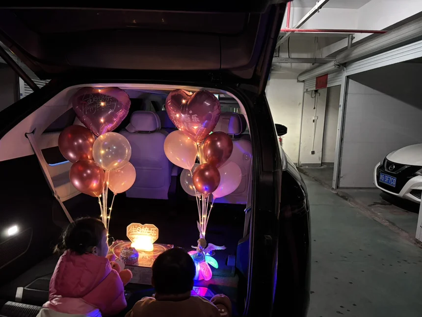 车内,我提前布置好的彩带灯光突然亮起——像不小心倾倒了一罐蜂蜜,光缓缓流淌在每个角落。中控屏上是我给孩子画的壁纸(手残党)。车内有白雪公主以及爱心萌可玩具。翻转折叠的第三排变成了移动的童话堡垒。屏幕上的星光点点,仿佛整个银河都来倾听这个在车轮上许下的心愿。
