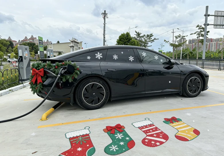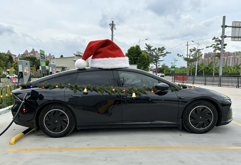 我的圣诞座驾小鹏p7+和圣诞节还挺搭,黑色的车身配上红绿的装饰,在路上也会更加抢眼哈哈哈