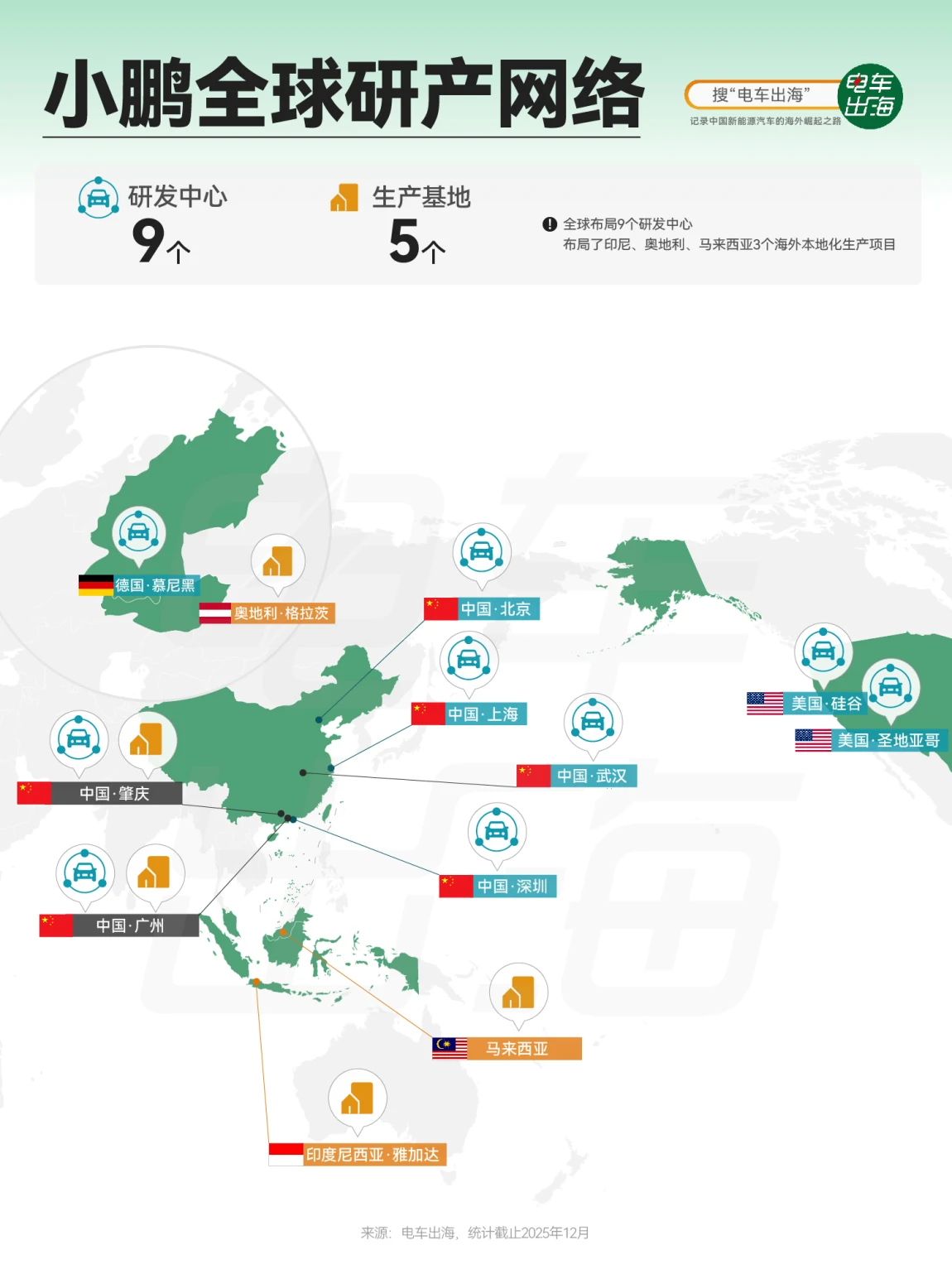 为支持全球业务拓展,小鹏已建立覆盖超50国321家海外销售服务网点,并在全球布局9个研发中心。今年以来,小鹏于印尼、奥地利(与麦格纳合作)、马来西亚三地落地海外本地化生产项目,这标志着小鹏正从产品出口向“研发+制造”一体化的全球智造模式深化推进。
