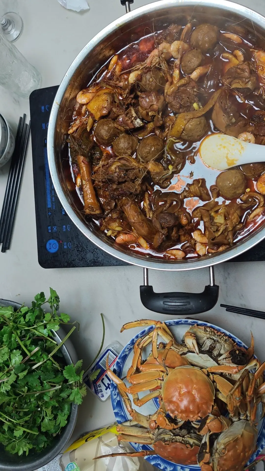 晚上直接自己在家煮一锅香辣美味的烧鸡公,再配上大闸蟹,美美的一杯小酒。