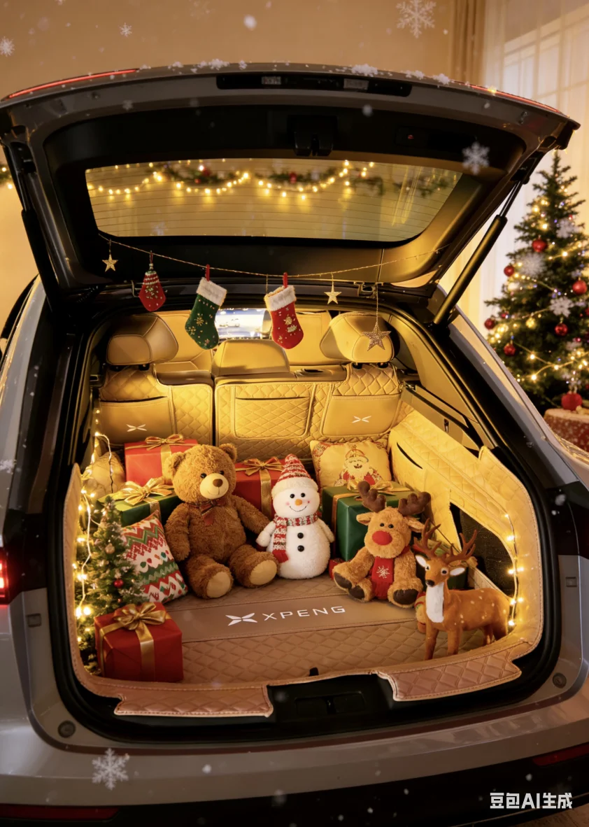 Mona车尾挂着铃铛、贴着“小鹏友”超可爱,后备箱更是堆满圣诞玩偶和礼物,把一整个圣诞童话都装了进来~