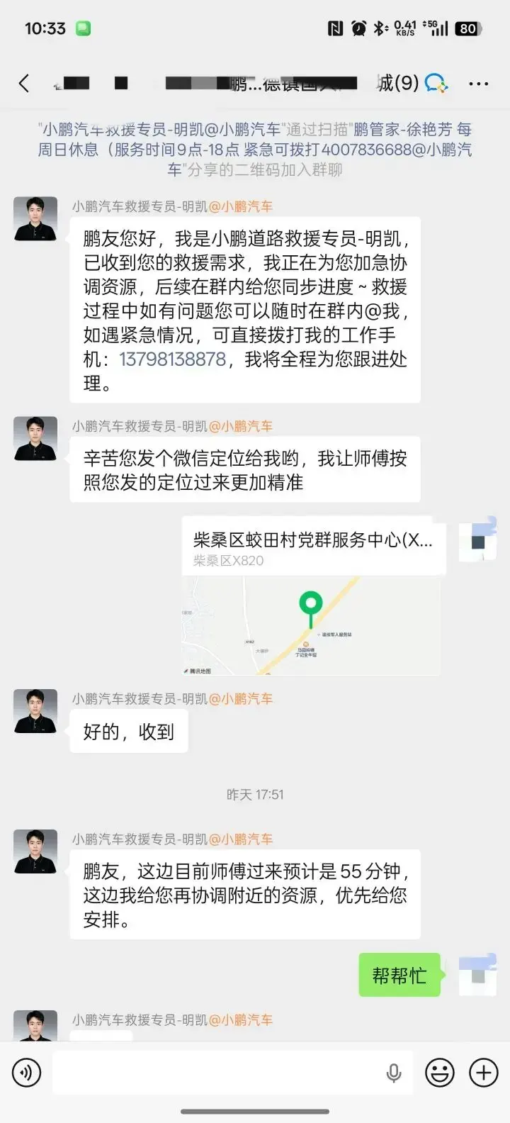 12月中旬周末返程途中,车辆行至105国道时右后轮胎被杂物割伤爆胎,仪表盘提示胎压为0。情急之下我通过官方渠道求助,小鹏救援响应迅速,不到10秒接通专线,工作人员高效调度救援资源,协调就近救援车30分钟内抵达现场。期间,救援专员不仅同步救援进度,还贴心提供轮胎数据,指导查找连锁维修厂。抵达后,在工作人员远程指导下开启“救援模式”,车辆顺利拖至修理厂完成更换。全程救援高效专业,让我在寒风夜雨中倍感安心,最终在HNGP辅助下安全到家。